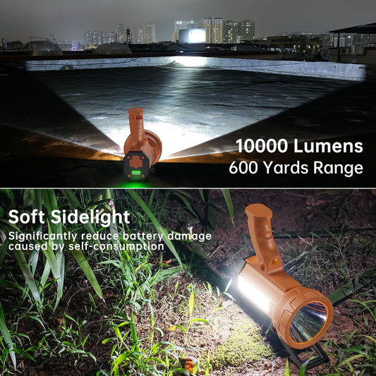Rechargeable Spotlight Flashlight, 1000,000 lumens 600 Yards Range IP65 Waterproof Spot Lights Handheld Large searchlight with red Lens Side Flood Light Light USB C Recharge (Bright Yellow)