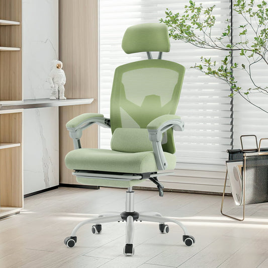 Ergonomic Office Chair, High Back Mesh, Reclining with Footrest, Lumbar Support, Adjustable Headrest, and Armrests, Green