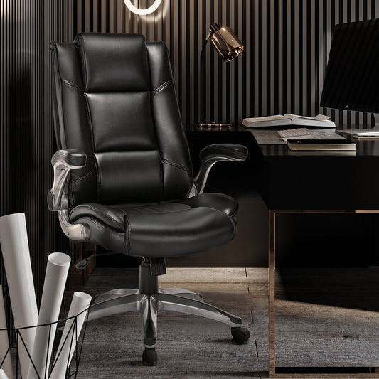 Leather Executive Office Chair- High Back Home Computer Desk Chair with Padded Flip-up Arms, Adjustable Tilt Lock, Swivel Rolling Ergonomic Chair for Adult Working Study, Black