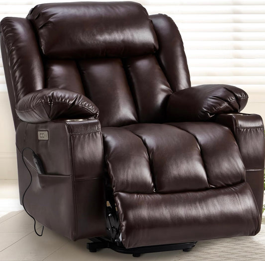 Large Power Lift Recliner Chair with Massage and Heat for Elderly, Overstuffed Wide Recliners, Genuine Leather with Breathable microporous, USB Ports, 2 Cup Holders (Brown)