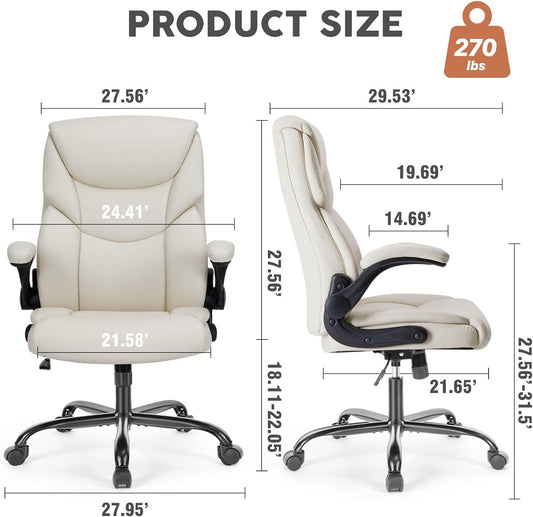 Office Chair, Ergonomic High Back Heavy Duty Task Chair with Flip-up Arms, PU Leather, Adjustable Swivel Rolling Chair with Wheels, Cream