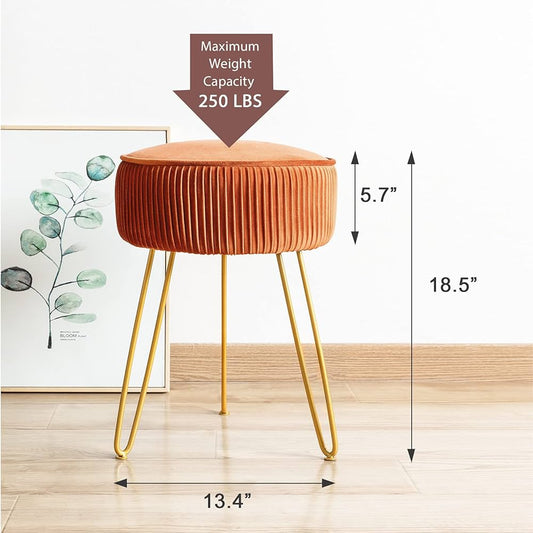 Pleated Vanity Stool, Velvet Upholstered Vanity Stool for Makeup Room, Round Mondern Stool for Vanity, Ottoman Footrest Stool with Metal Legs for Living Room, Bedroom, Pumpkin Brown