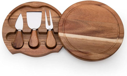 Round Slide-Out Acacia Wood Cheese Serving Board and 3 Piece Cheese Tool Set, 7.5 inch Diameter, Ideal for Outdoor Picnic Housewarming Kitchen Personalized Gift