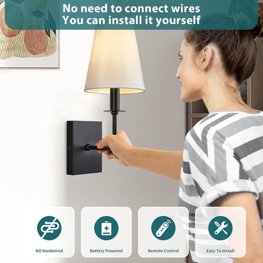 Set of 2 Rechargeable Battery Operated Wall Sconces with Remote Control, No Wiring 3000/4000/6000K Dimmable Wall Light with White Fabric Shade and Black Long Slim Arm