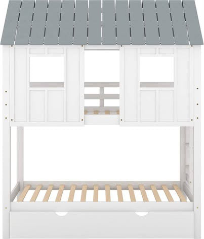 Quarte Twin Over Twin House Bunk Bed with Slide and Windows, Wood Low Bunk Bed with Ladder and Guardrails,Designed for Toddlers/Kids/Teens/Girls/Boys