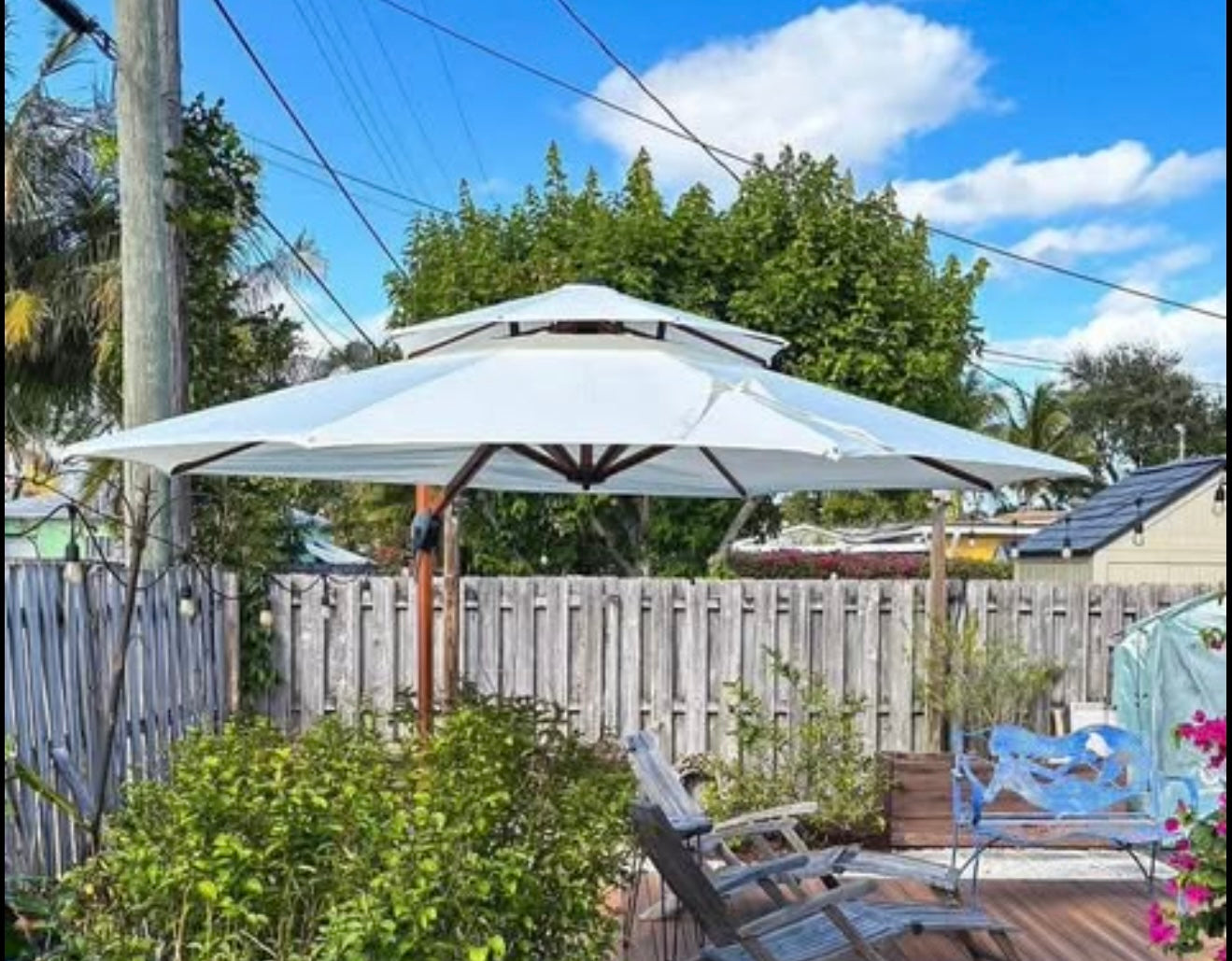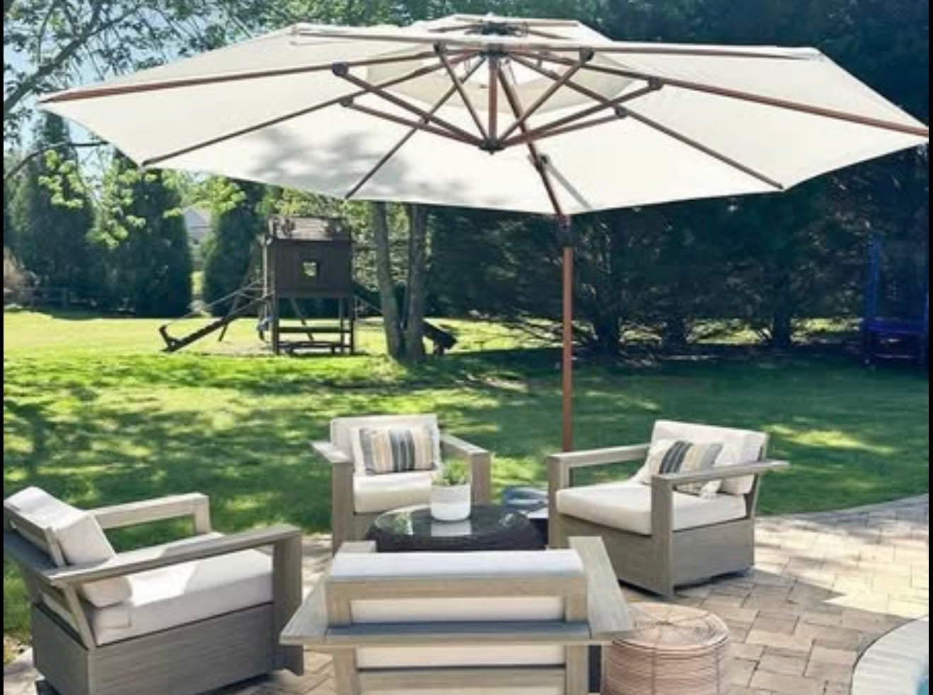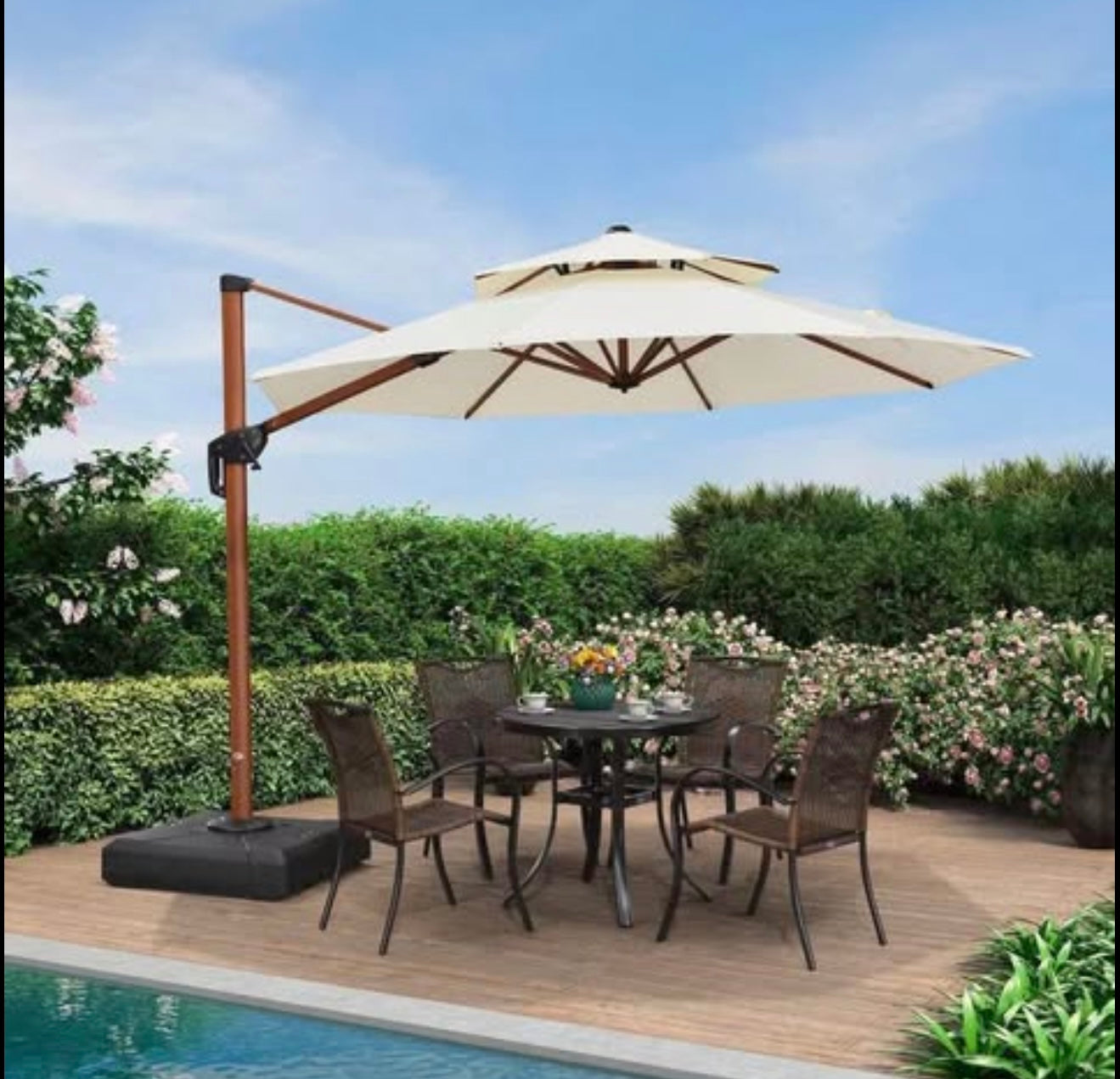 Featuring a rich cream canopy and a warm, wood-look frame, this umbrella does more than provide shade,it elevates your entire outdoor setting. Its wide cantilever design keeps the pole out of the way, giving you an unobstructed view and easy conversation, while the adjustable tilt allows you to chase the shade or bask in the sun at your leisure.