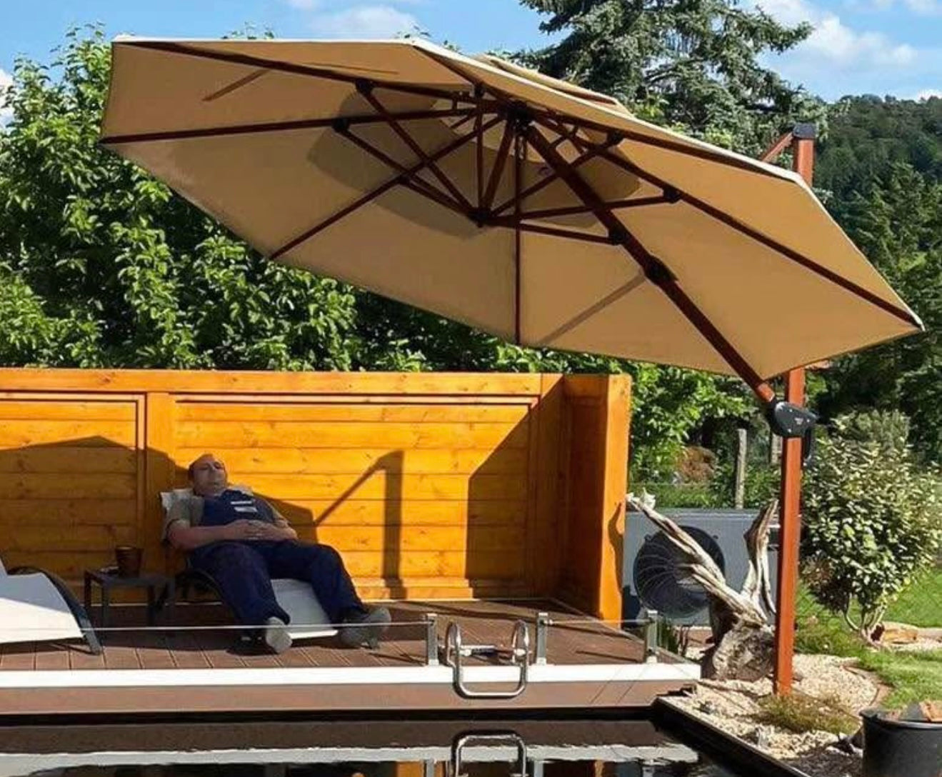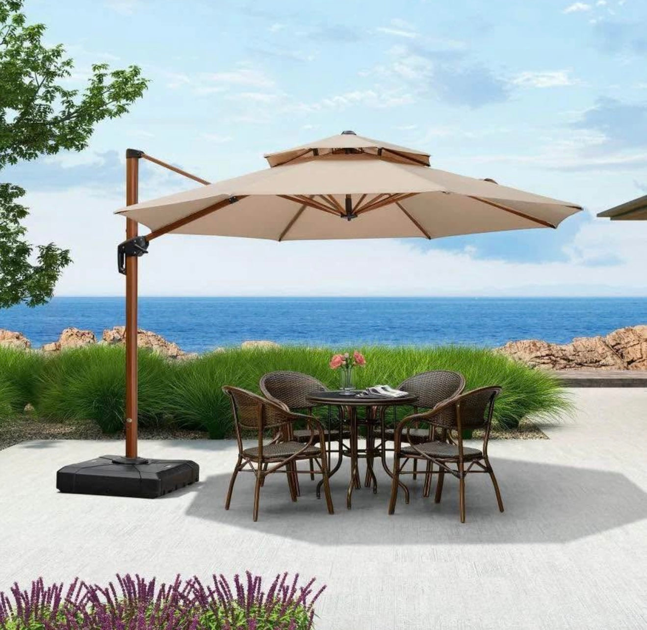 With its beautiful beige canopy and warm, wood-inspired frame, this umbrella offers more than just shade, it brings a touch of sophistication to your entire outdoor space. The expansive cantilever design keeps the support pole out of your way, ensuring clear views and effortless conversation, while the adjustable tilt lets you stay comfortably in the shade or soak up the sun whenever you choose.