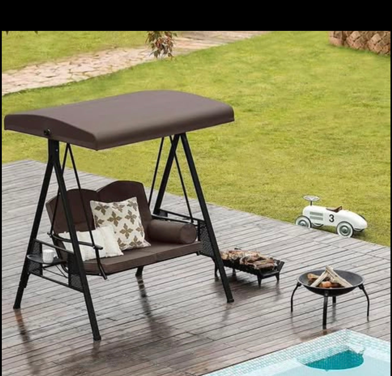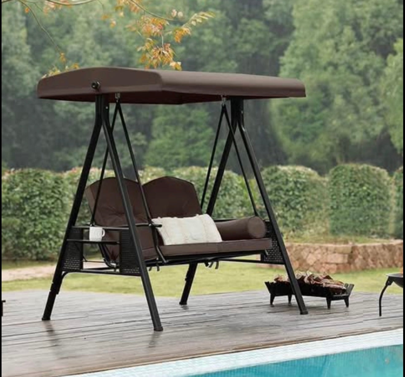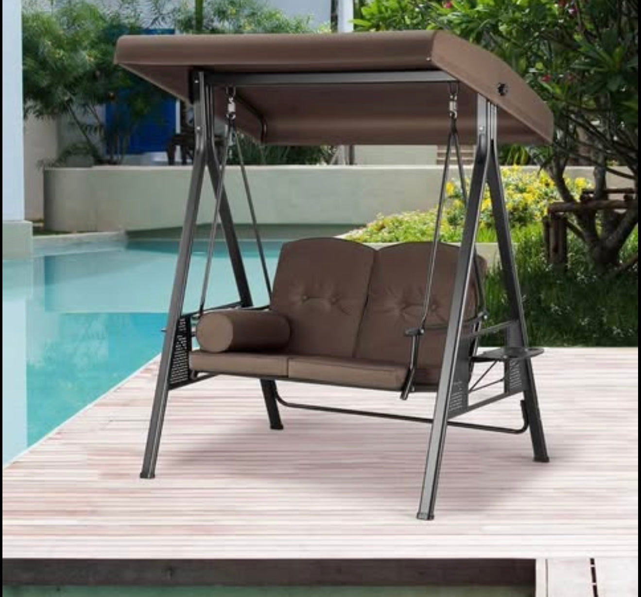 Comfortable and Stylish: The canopy of this ports swing can be rotated, provides optional shade coverage for sunshade all day long. Two wide removable seats give you plenty of space. Soft cushions makes it more relaxing and comfortable for your back or arm in a relaxing break. Two functional and foldable side tables included.