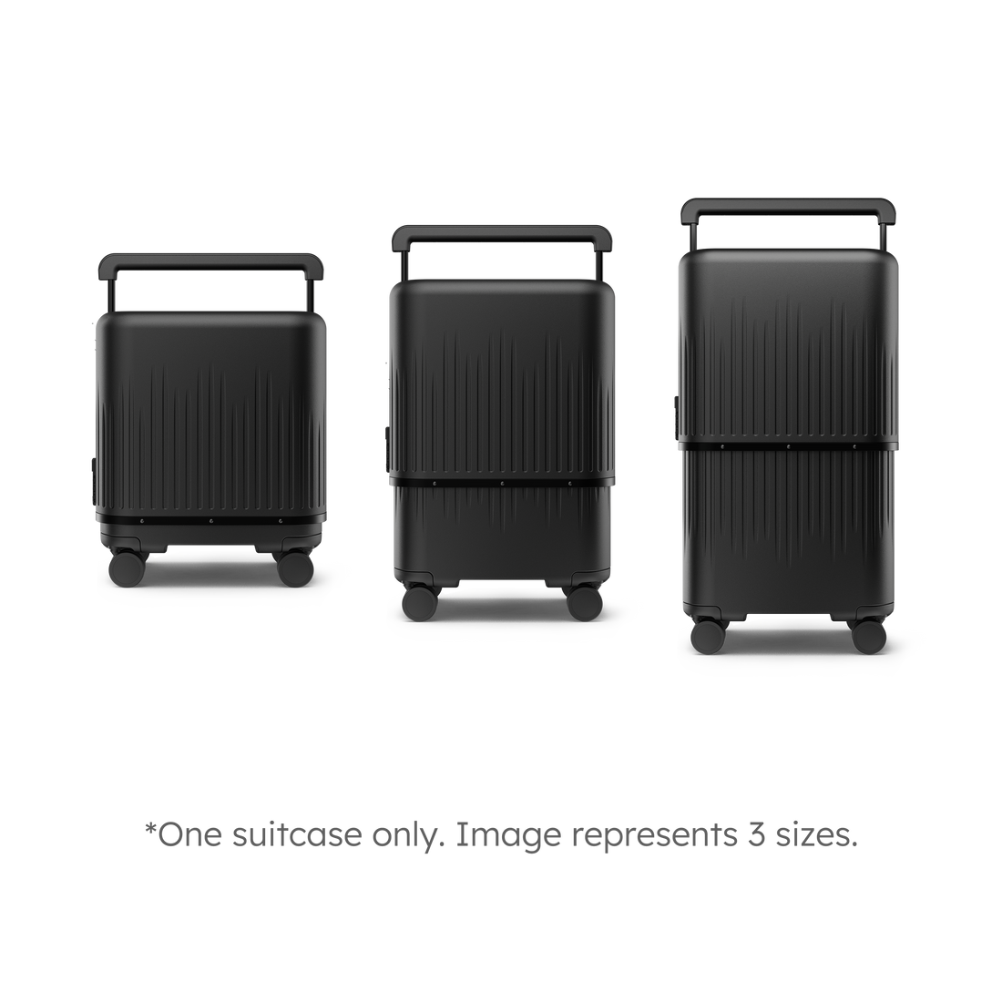 This hard-side expandable suitcase that can easily switch between 3 sizes: 16" Small Carry-on; 22" Medium Check-in; 26" Large Check-in.