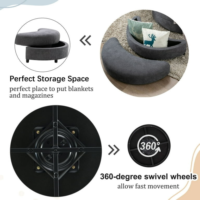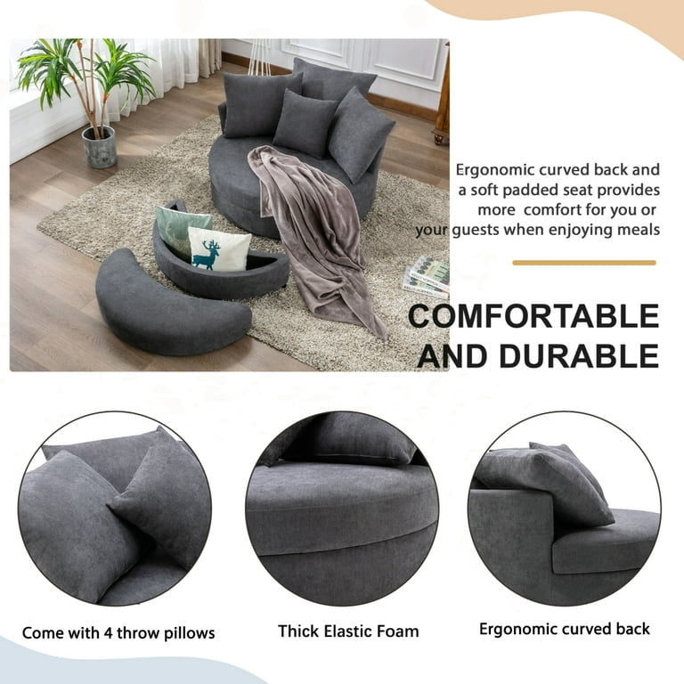 - [Modern Stylish Design]:Our swivel accent barrel chair is equipped with a pillow backrest and a half-crescent-shaped storage footstool.Matching ottoman bench can be used to kick your feet up for relaxation.The ottoman provides perfect place to put blankets and magazines,keep your living room clean and save your space.4 movable cushions,which can be used not only as a cushion but also as a pillow