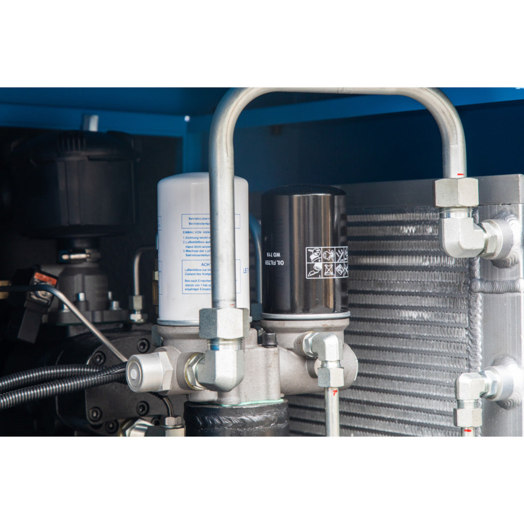 A rotary screw air compressor is a positive displacement compression system that includes a pair of matching helical screws. An oil-flooded rotary screw compressor includes a lubricant that fills the gap between the rotors, which creates an air-tight hydraulic seal and transfers mechanical energy between the two rotors. The air moves through the threads as the screws rotate, and the meshing screws force the air through the compressor.