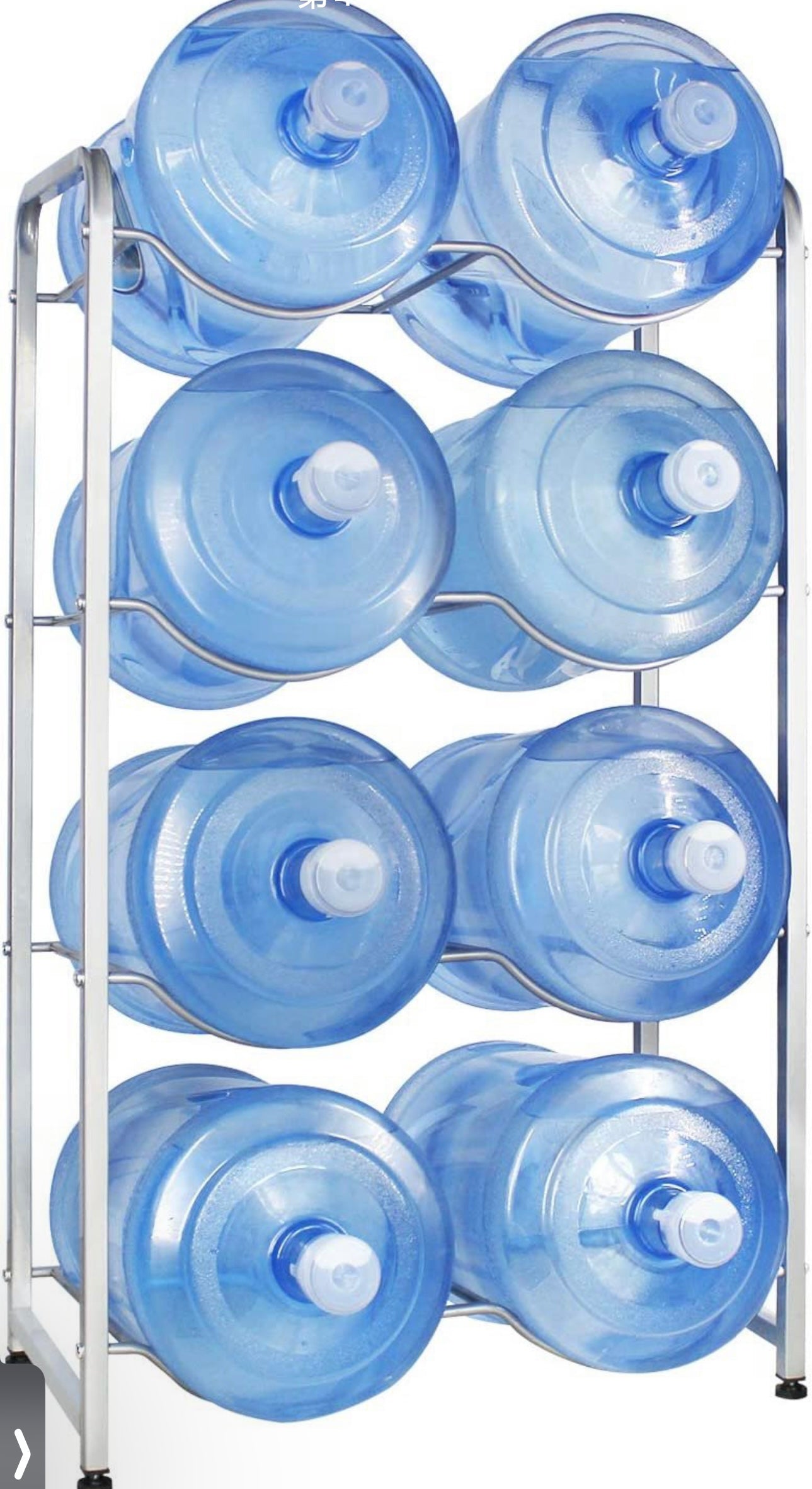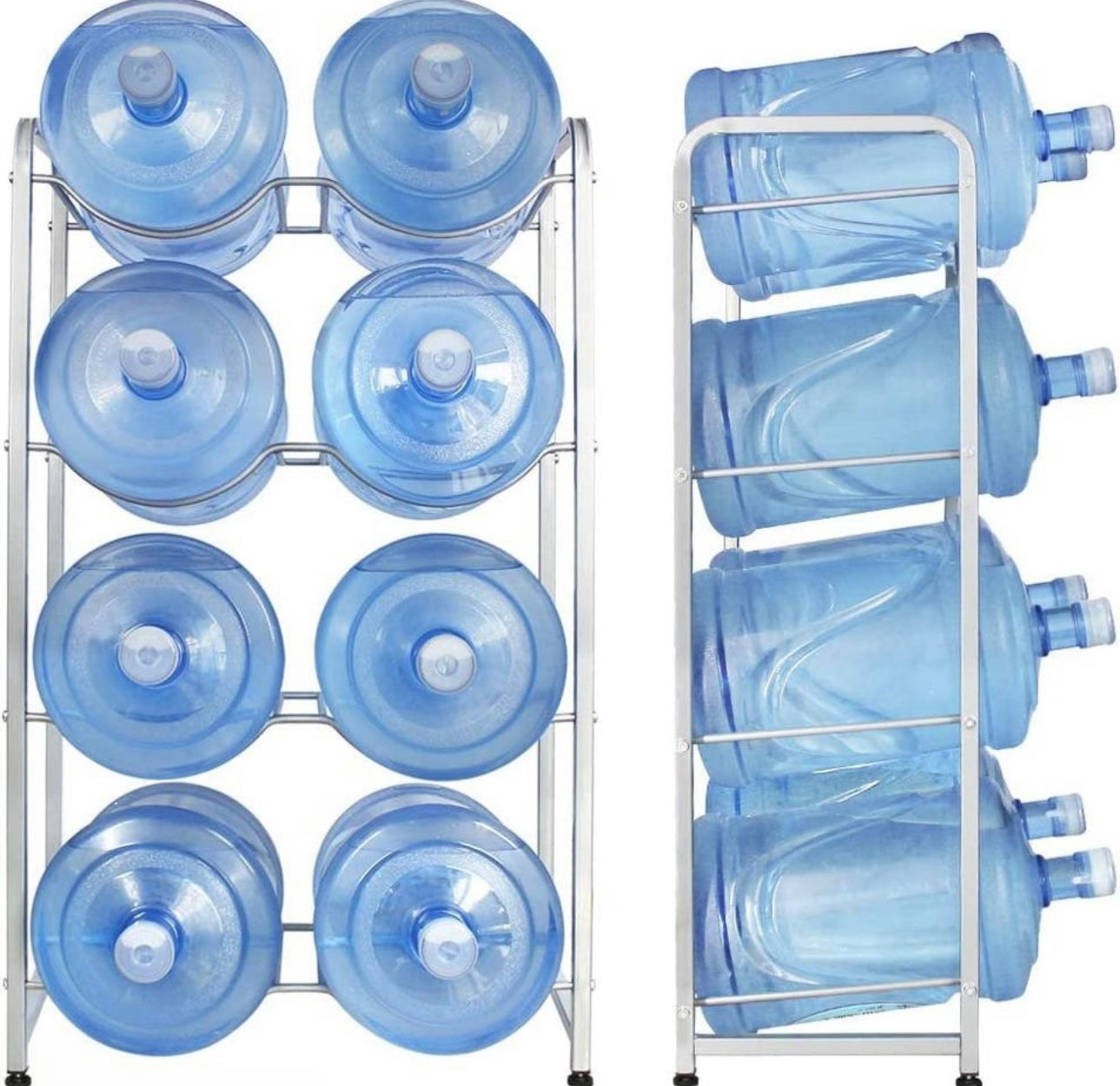 Capacity: The 4-tier water jug rack can hold up to 8 bottles of 5 gallon water. The total load-bearing is 300 pounds.