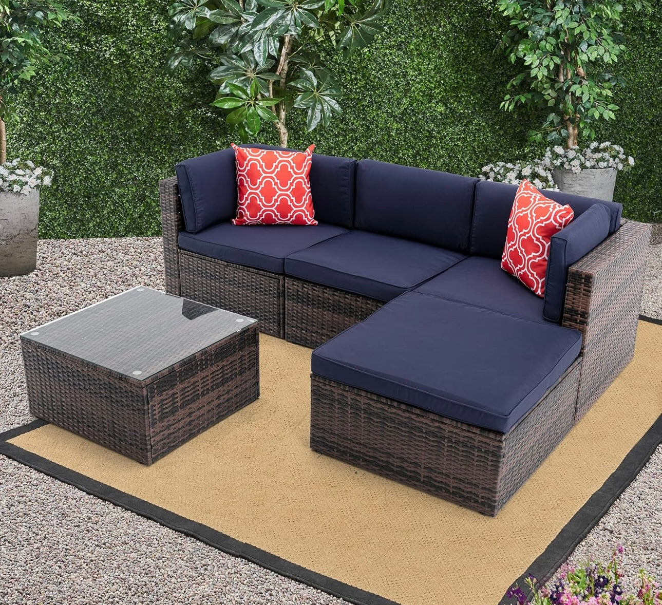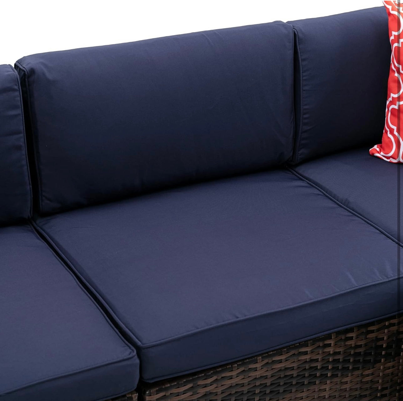 5Pcs Outdoor Garden Patio Furniture PE Rattan Wickerectional Cushioned Sofa Sets with 2 Pillows and Coffee Tablemodular sectional Sofa Sets with roof XI910, Navy Blue