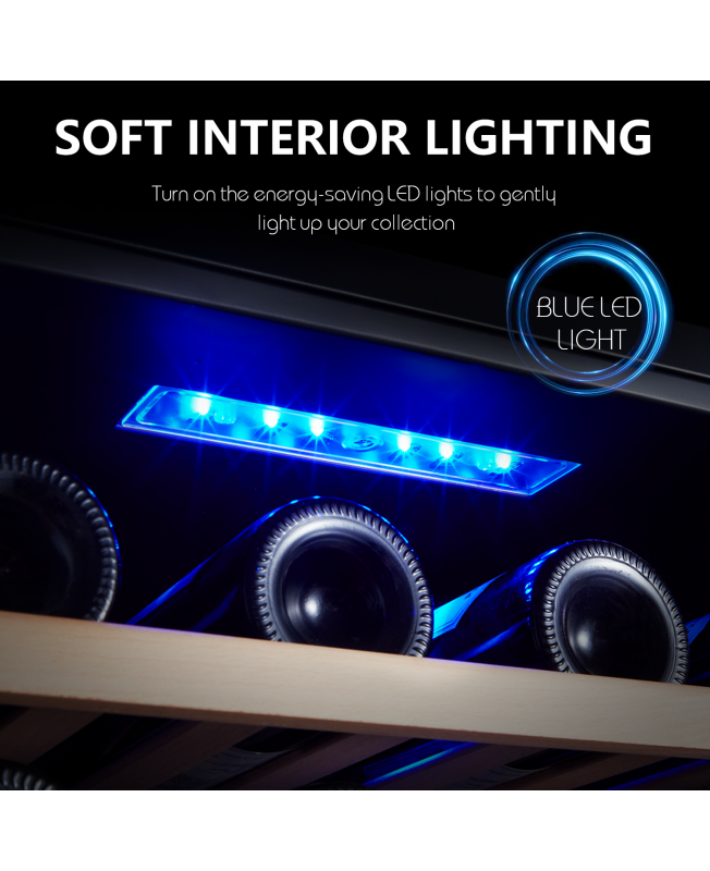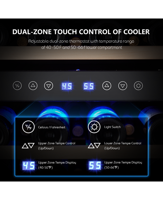 Blue LED Display shows temperature from 40°F-66°F and can be easily adjusted with up/down arrows. One-touch temperature control, easy to storage your wine at best taste