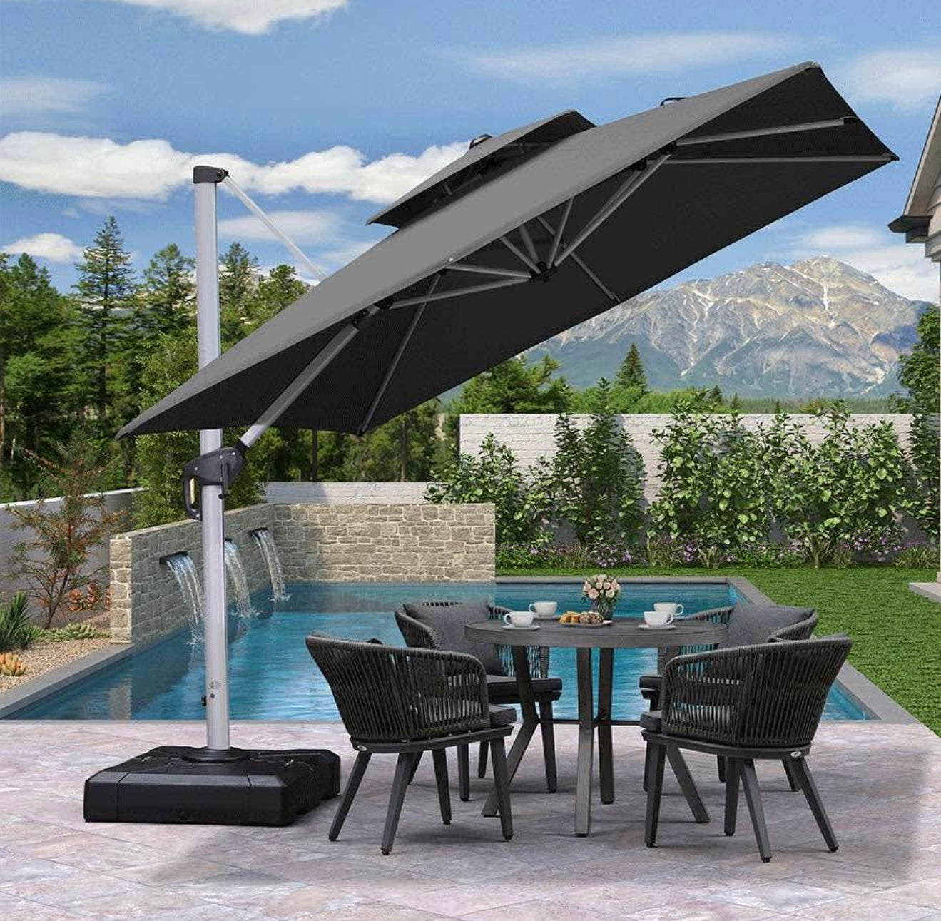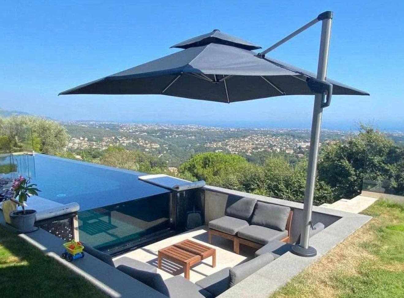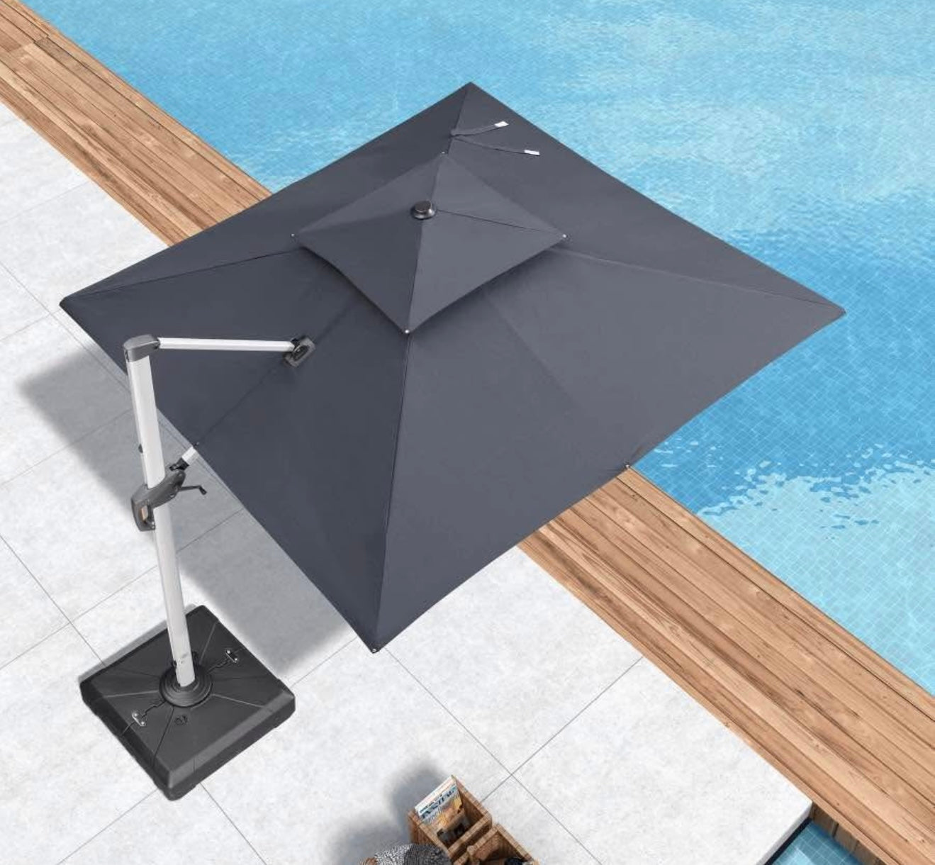 This elegantly crafted umbrella features a dual canopy system for superior shade and a cantilever design that eliminates the need for a central pole, providing clear visibility and plenty of unobstructed seating space.