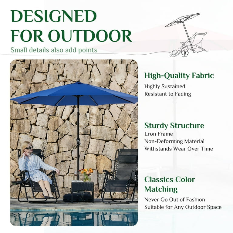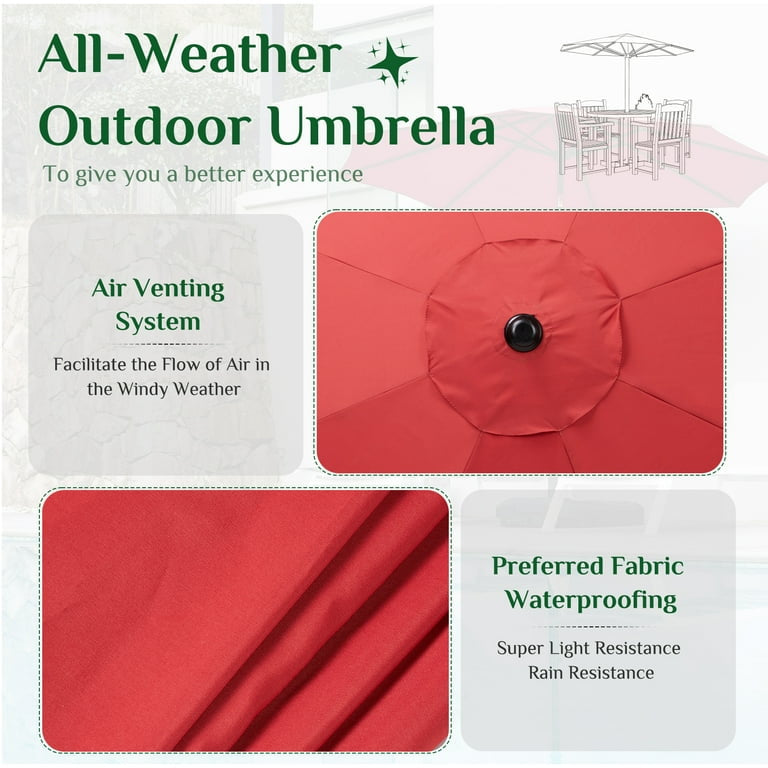 - WATERPROOF & UV PROTECTION- The table umbrella outdoor patio is made of 100% heavy duty polyester fabric, waterproof , UV protection, long lasting, easy to clean. Double sewing longer rib pockets better prevent the ribs from leaving the umbrella cover.
