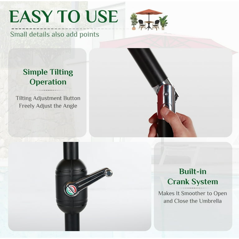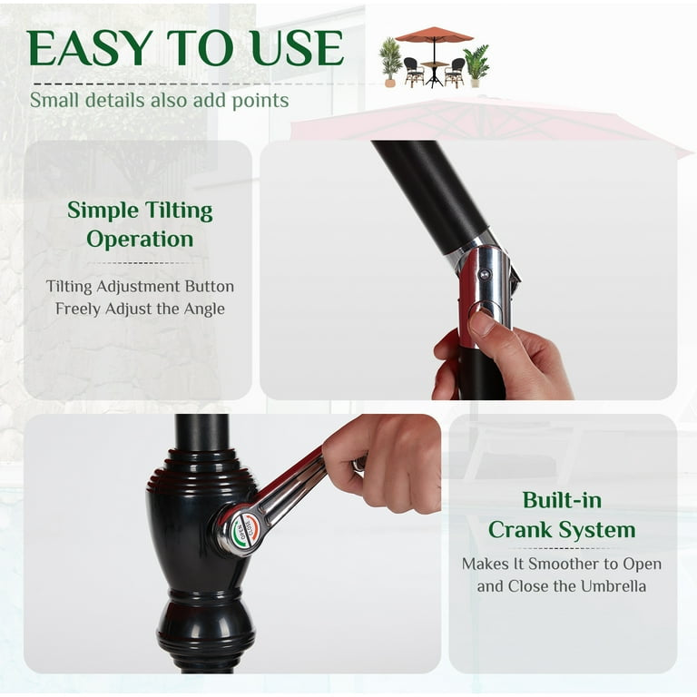 - TILT & CRANK & AIR-VENT DESIGN - You can adjust the outdoor patio table umbrella to 45°angle (left or right) to block the sunlight, enjoy more shade. With crank system make you easy open and close the outdoor table umbrella. Air-vent top allow air flow while adding extra stability against gusts of wind.