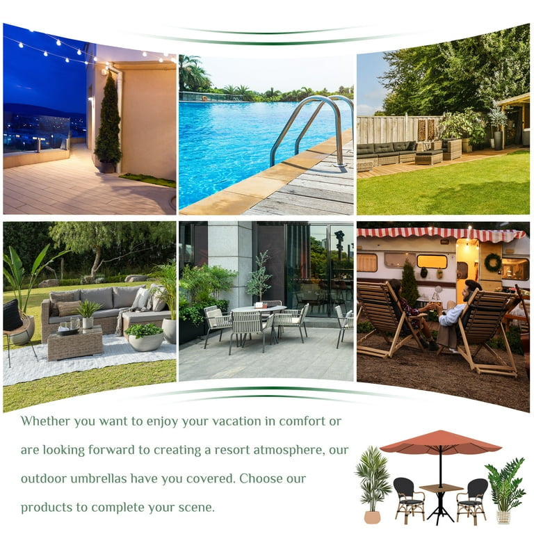 - 9 FT UMBRELLA & WIDELY USE- This patio table umbrella 9 feet diameter perfect for adding shade to your 42"- 54" round, square or rectangle table with 4 to 6 chairs. 9 foot umbrella patio is the best outdoor umbrella for your garden, yard, pool, table, deck, beach, balcony, cafe, restaurant and any other outside area.