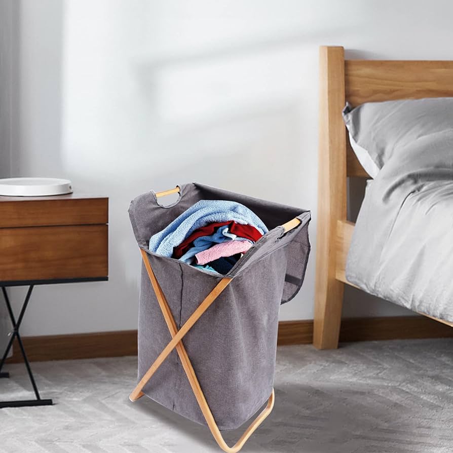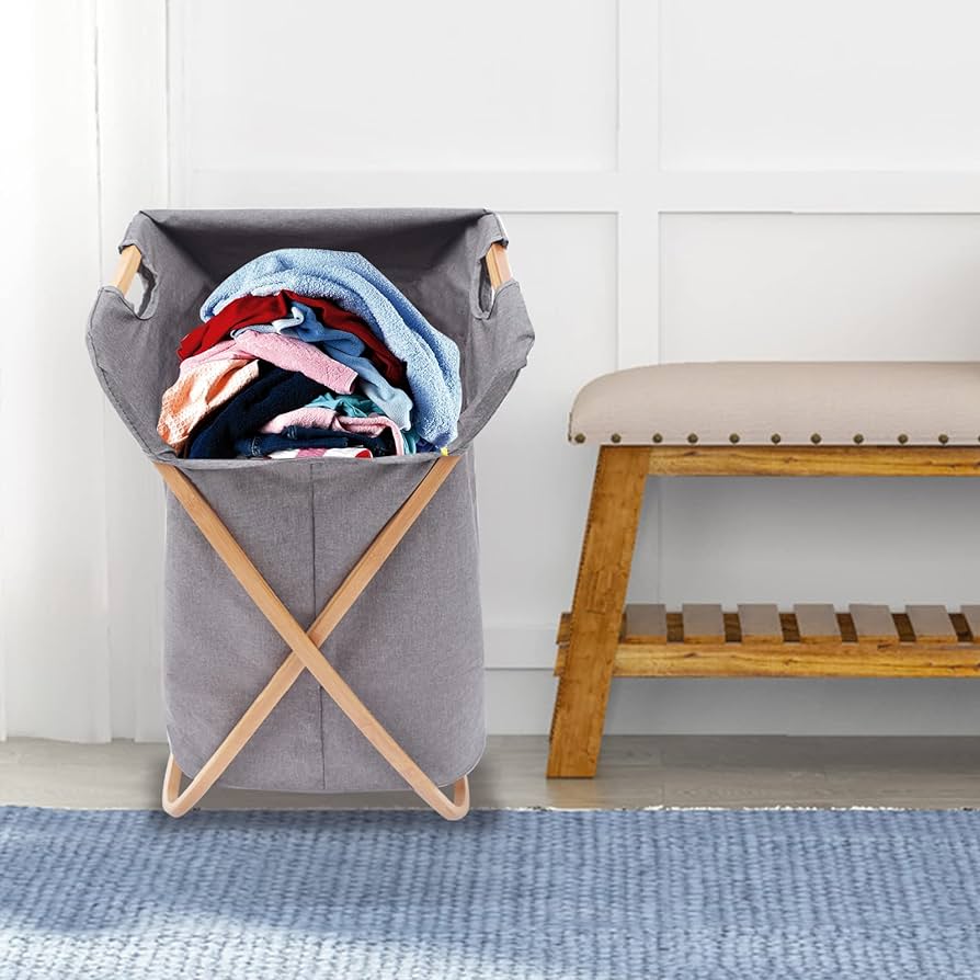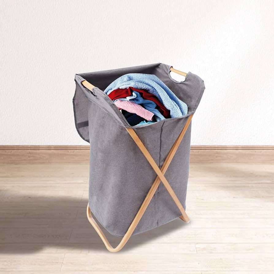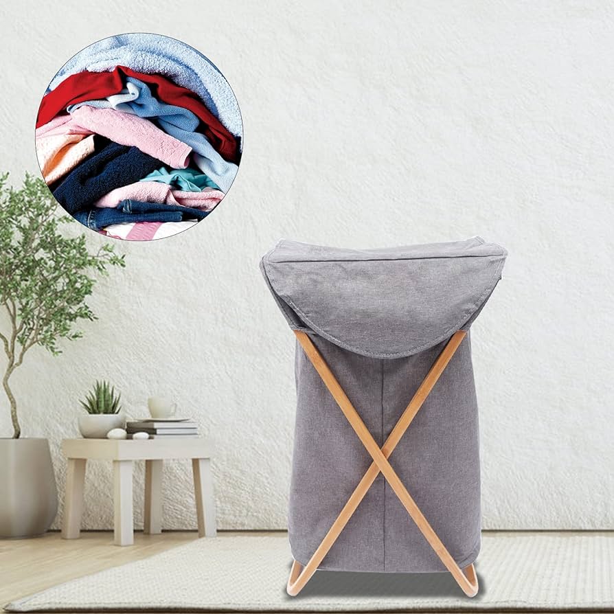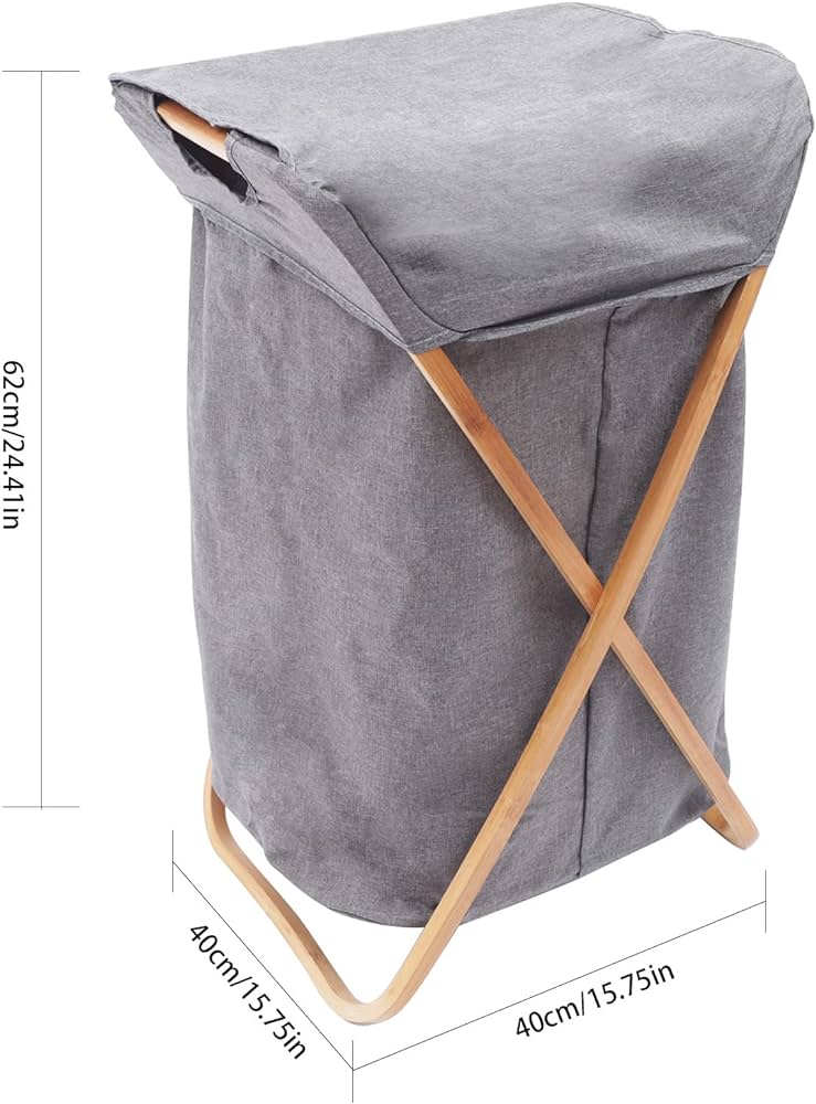 Bamboo Wood X-Frame Laundry Hamper,Grey Modern Portable and Foldable Dirty Clothes Laundry Basket Hamper Bag Bin with Lid Storage Organize Rack for Clothes Storage and Bedroom