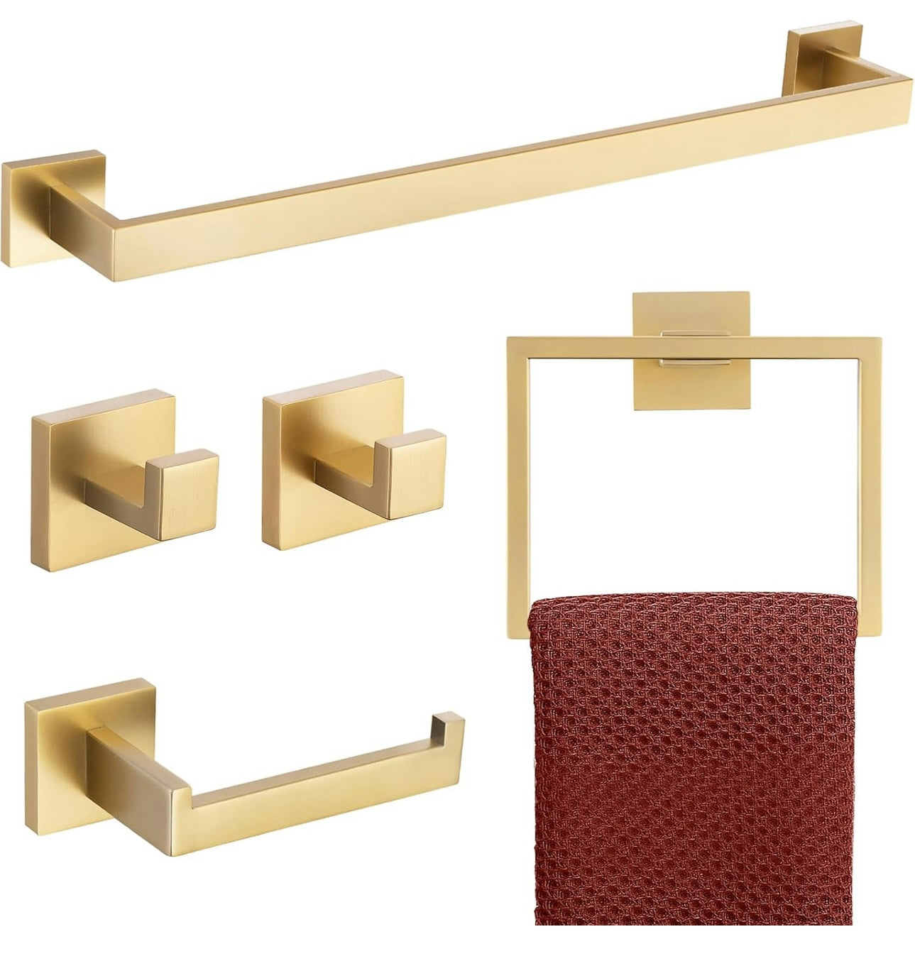 - 【SAVE MONEY】- Brushed Gold bathroom 5-piece towel bar set is more cost-effective. Single Towel Bar, Towel Ring, Tissue Holder, 2×Towel Hooks.