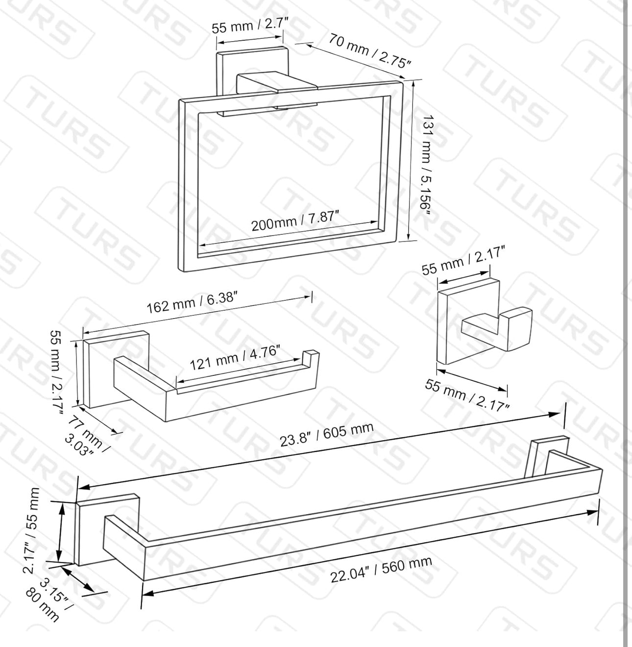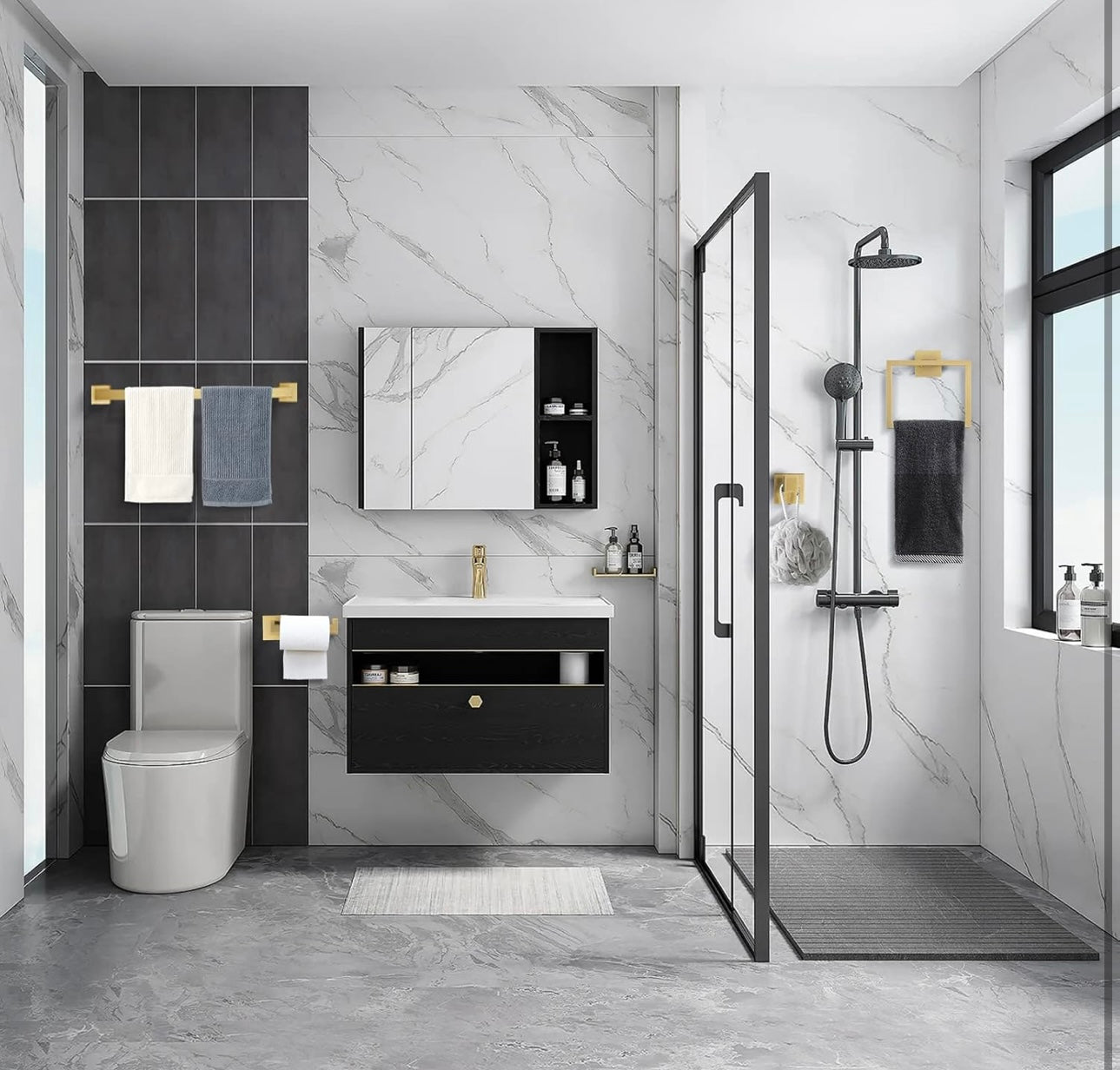 - 【MODERN & SAFE DESIGN】-Designed with clean lines and sturdy construction, the bathroom accessorries sets provide everyday efficiency with style. Unique squared shape and concealed mounting hole add a touch of modern design to your bathroom, chamfering edges protect your body from scratching.