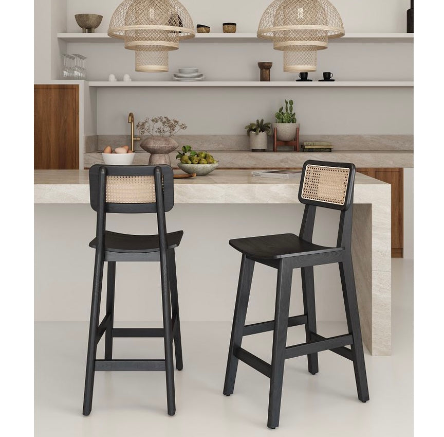 Effortlessly chic, the Versailles counter stool will add a contemporary look to any home. This solid wood counter height stool includes a sleek, generous, contoured seat and a stability stretcher that doubles as footrest. The sophisticated, versatile style of the wood rattan back gives a timeless look to any home, from farmhouse to penthouse.