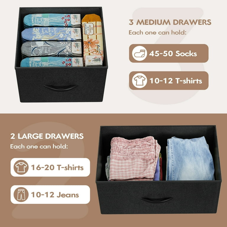 - 5 DRAWER CHEST: Features 5 removable foldable drawers; Easy pull handles help open and close the drawers smoothly; 4 adjustable feet protect your floor from scratches.