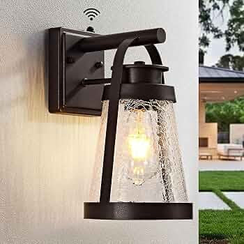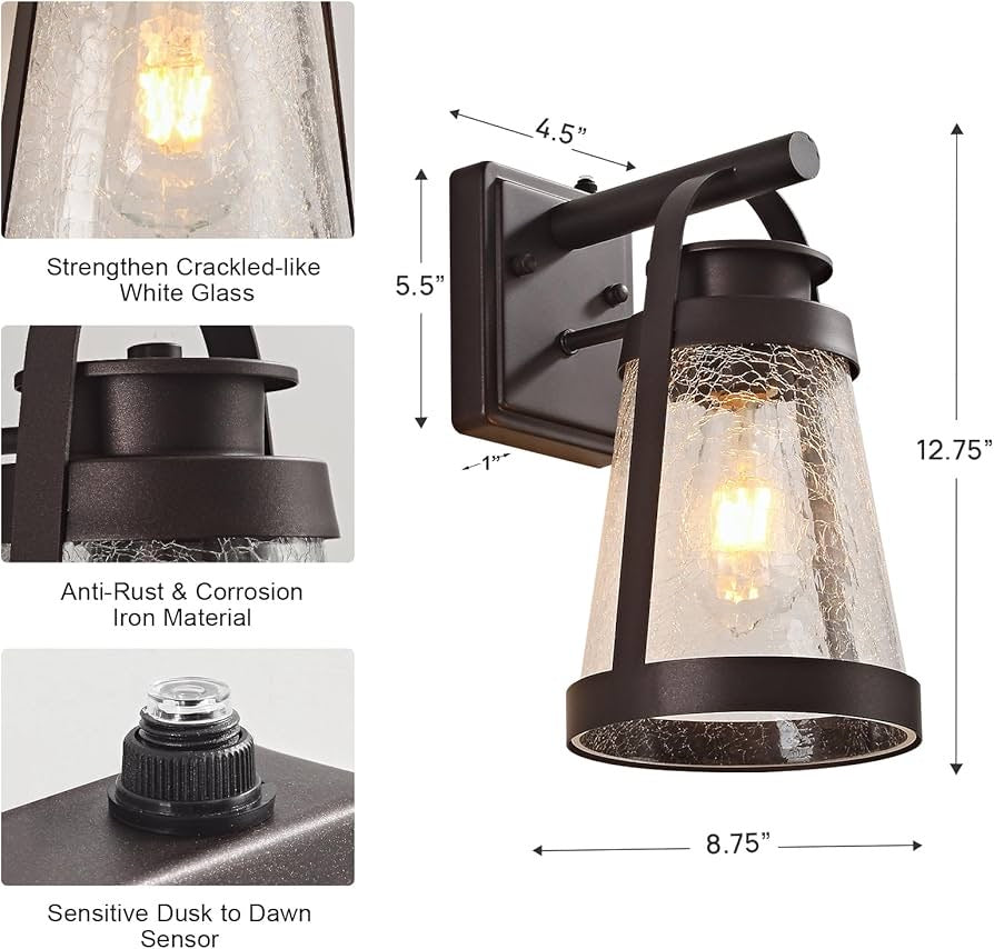 - Distinctive Design: Our outside garage lights with crackled glass and coffee brown finish, will add accent and style to your outdoor space. In addition, the lighting coming out from this dusk to dawn porch light is unique and warm, could easily create an cozy atmosphere to your sweet home.