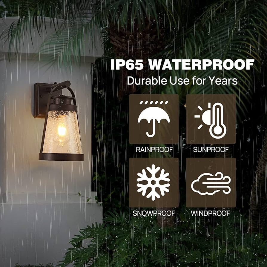 - Weather Resistance: Featured high-quality metal and sturdy glass, our outdoor wall lights are waterproof and durable. The anti-rust finish makes these coach lights outdoor could withstand all kinds of extreme weather: heavy rain, snowstorm, extreme temperature and so on. With its superior weather-resistant capabilities, it can perfectly match your garden, porch, corridor, doorway, hallway, courtyard, garage, etc.