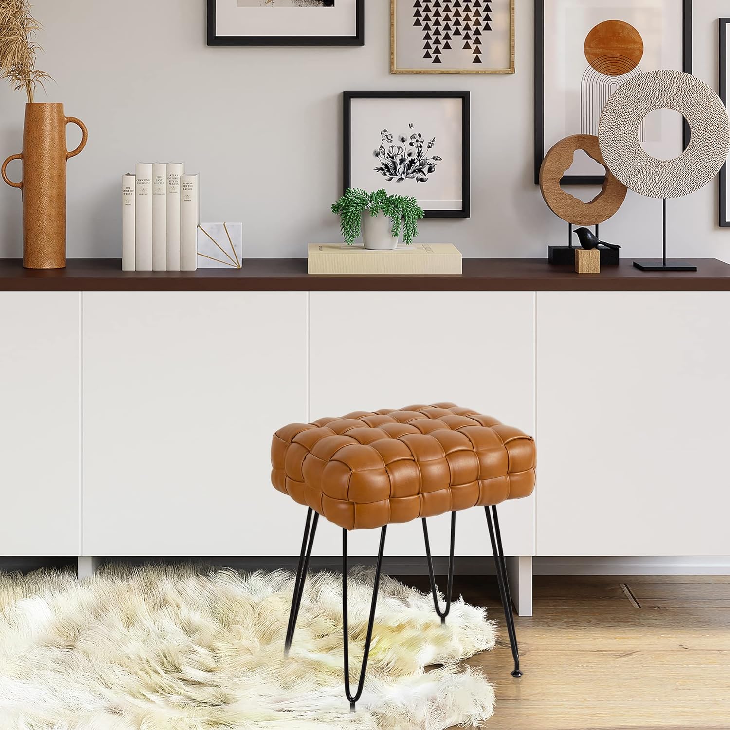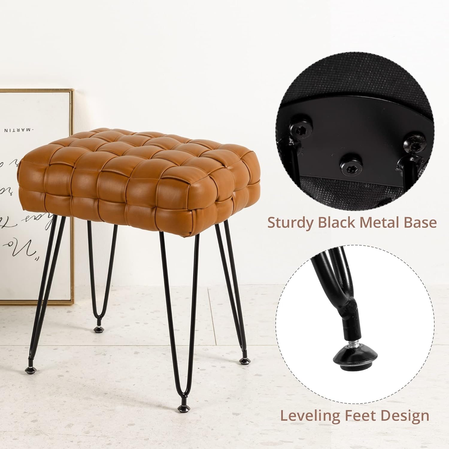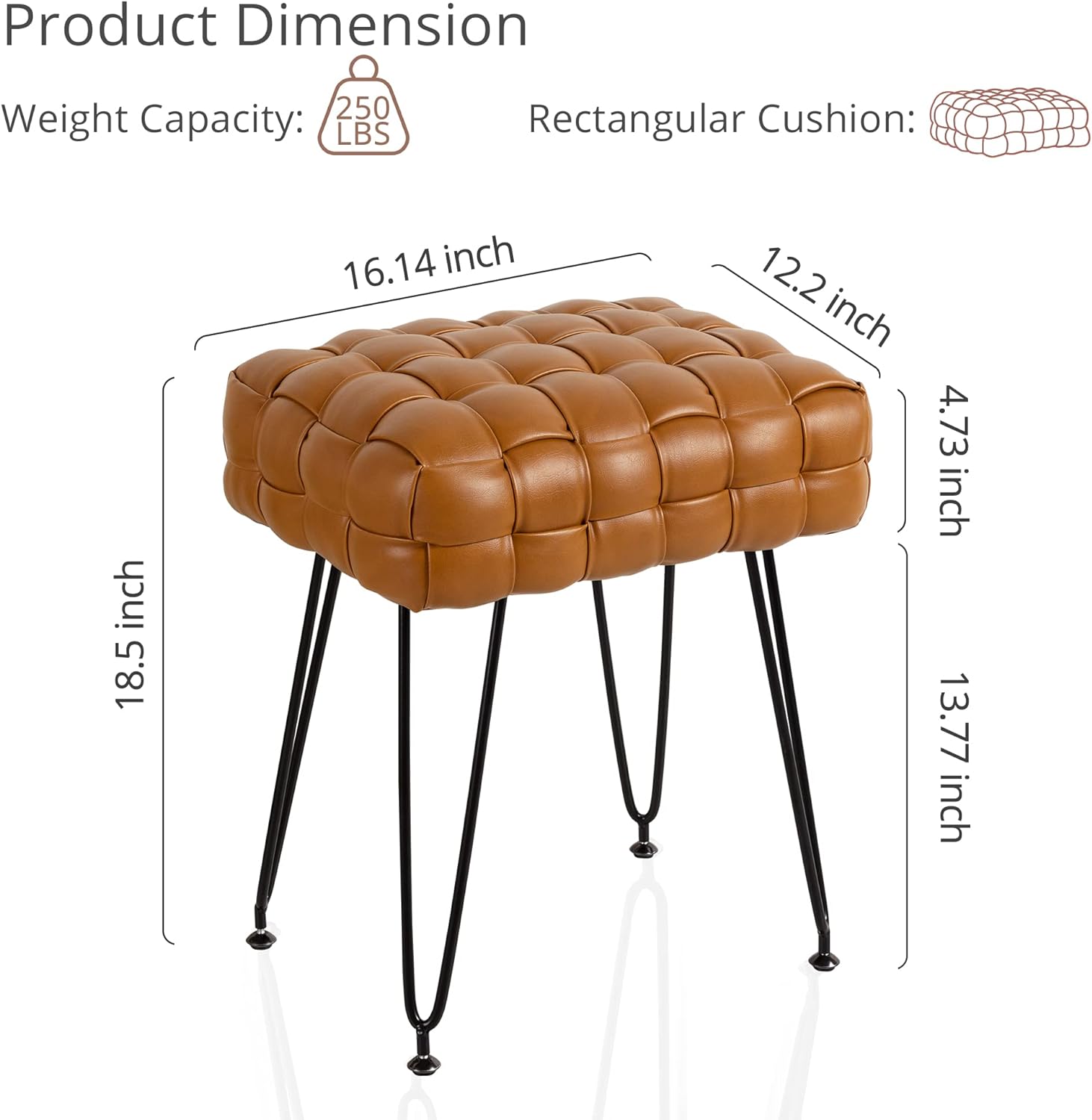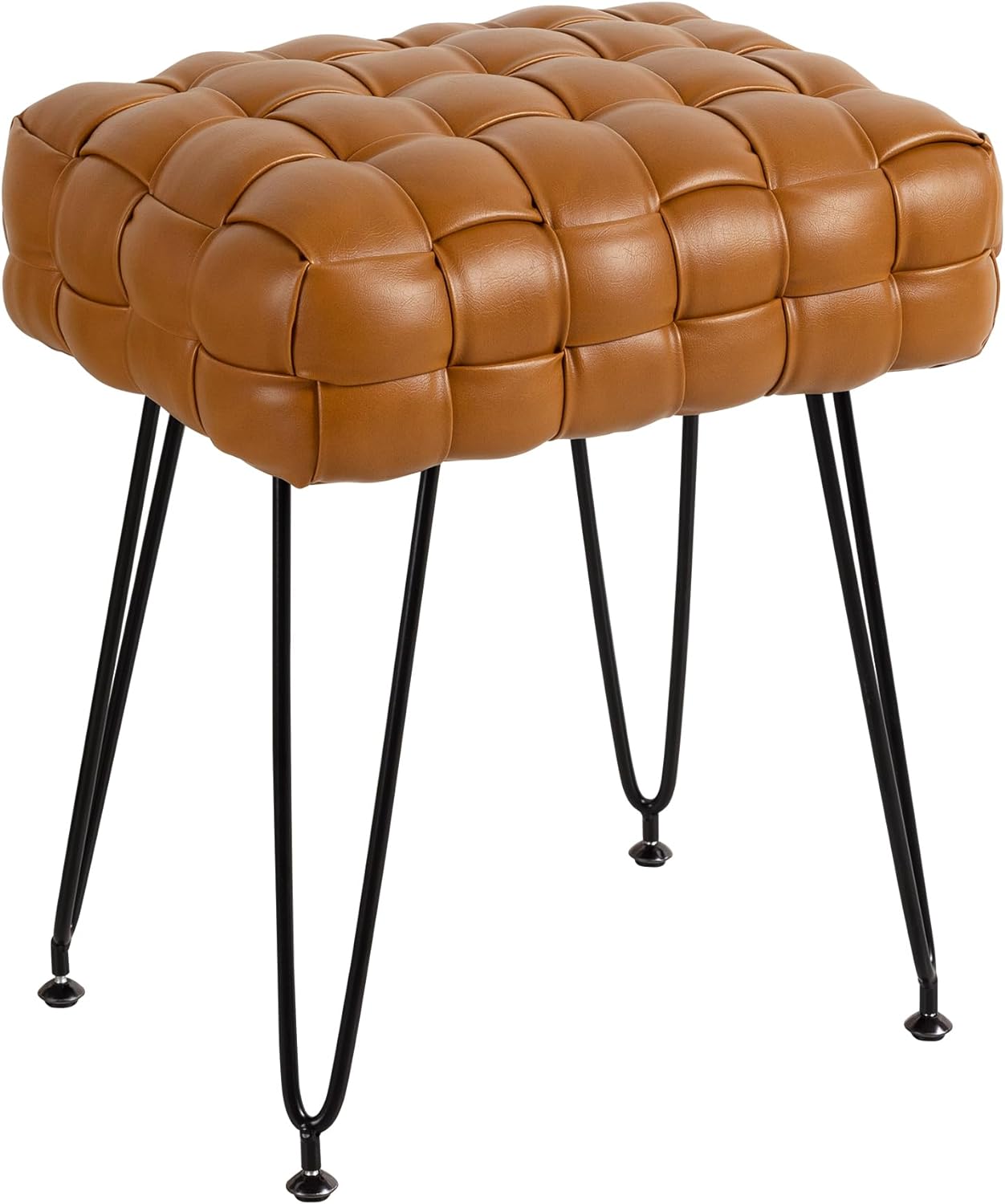Faux Leather Vanity Stool, Upholstered Make up Bench, Rectangle Ottoman Foot Stool, Tufted Footrest Stool Makeup Stool with Silver Chrome Legs for Living Room, Dressing Room, Whisky Brown