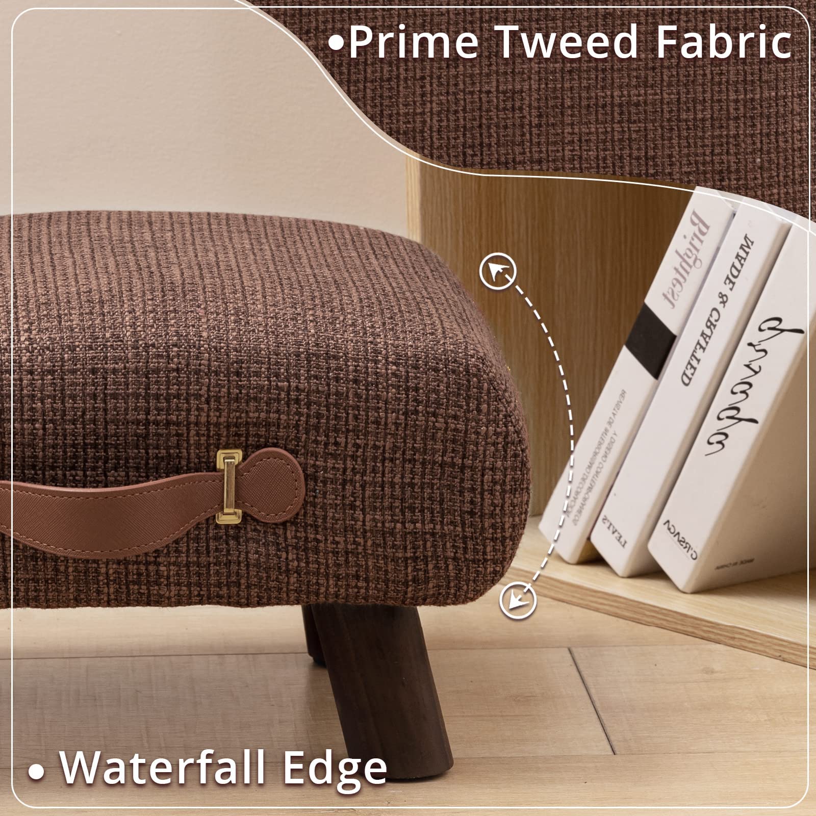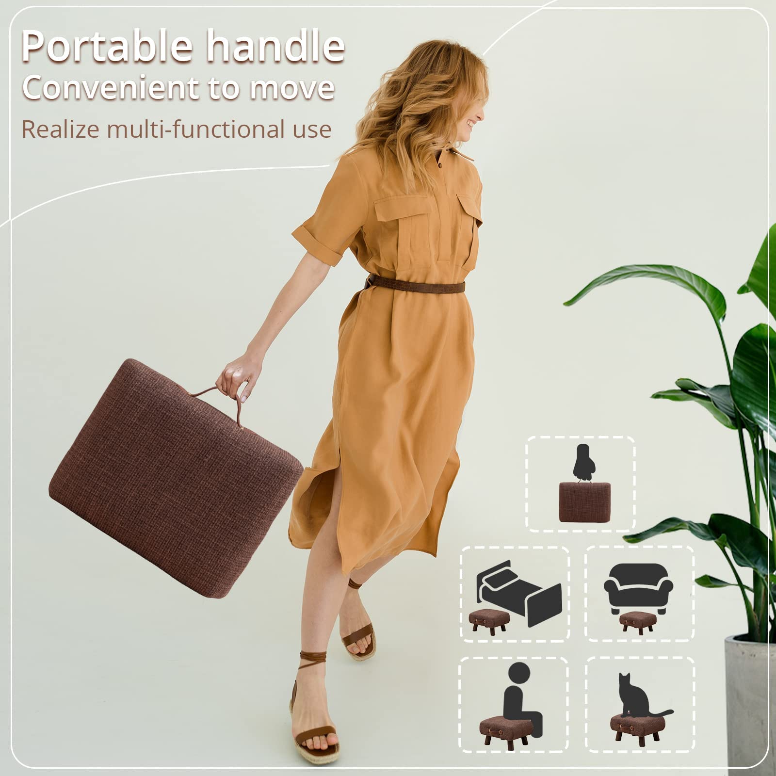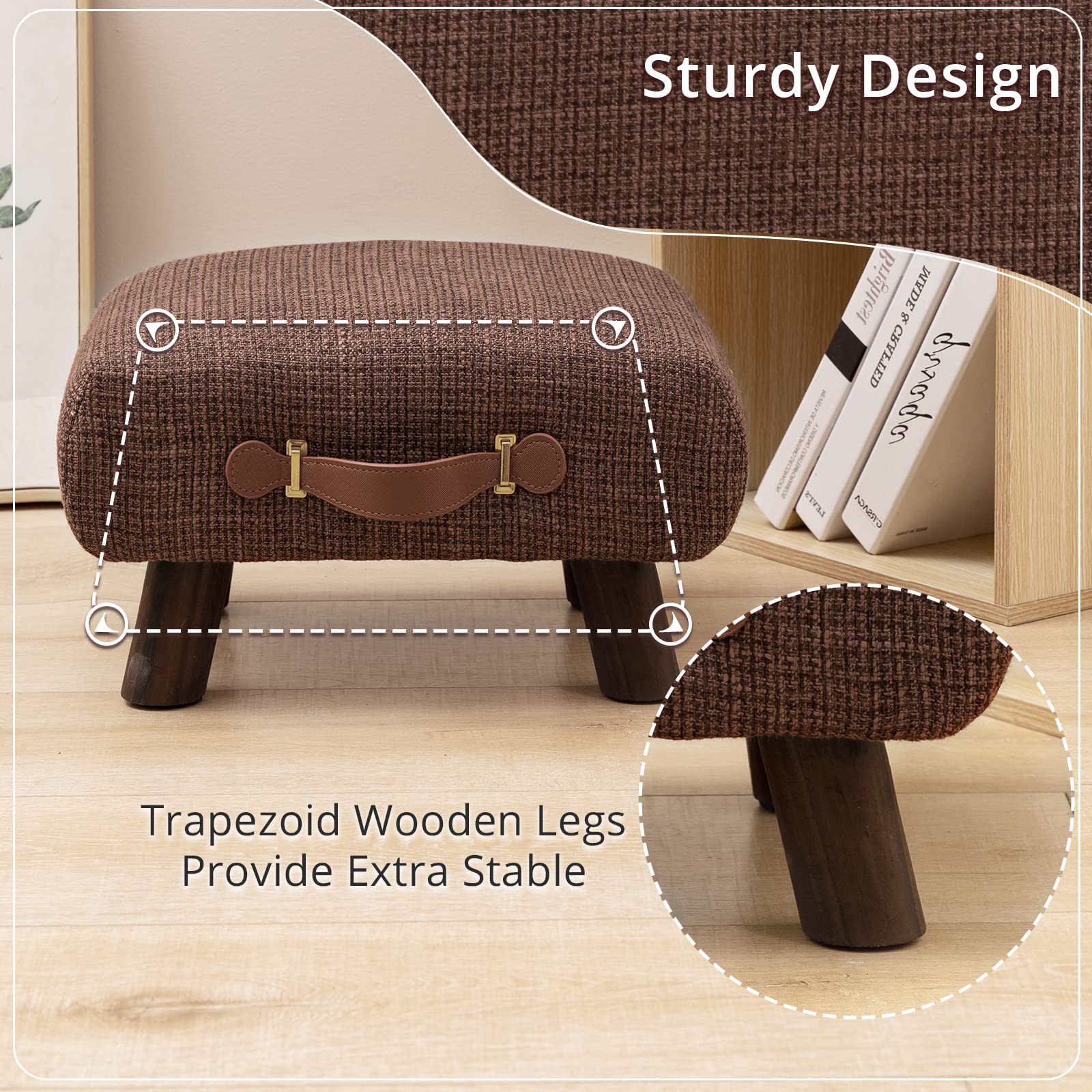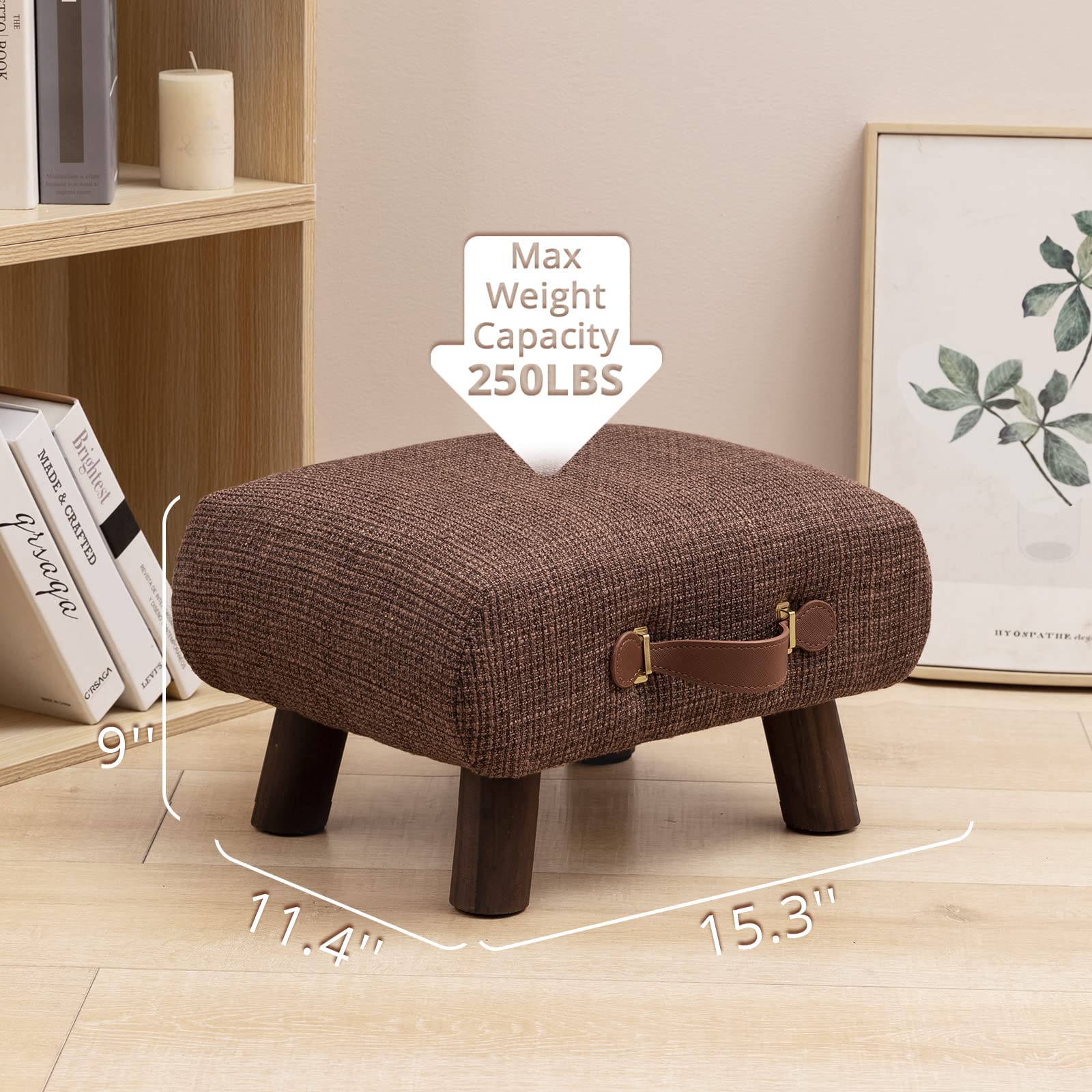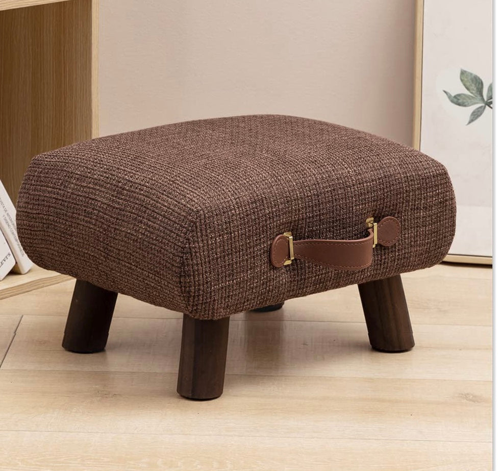 Foot Stool with Handle, Brown Footstool Elegant Small Foot Stool Rest with Wooden Legs, 9''H, Rectangle Fabric Foot Stools for Adults with Waterfall Edge, Ottoman for Living Room, Desk, Bedroom, Couch