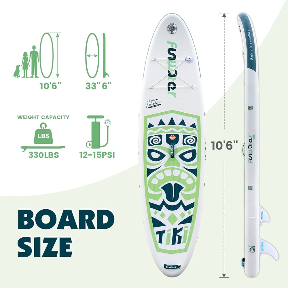 - Funwater's unique ergonomic handle design allows you to inflate your paddle more easily in a shorter time. The sensitive barometer ensures that you can read the sup inflation pressure value (12-15psi) at any time. The multifunctional elastic string can tightly fix any objects placed on the inflatable paddleboard. The multipurpose and ultra-large backpack can help you easily carry the paddle to any of your dream places.