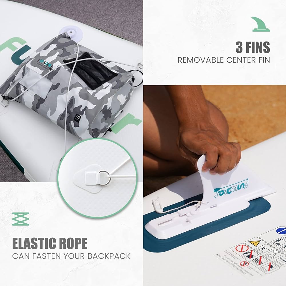 - 1 inflatable paddle board, 3 removable and adjustable paddles ,3 removable fins , 1 SUP pump, 1 backpack , 1 shoulder strap,1 waterproof phone bag, 1 leash