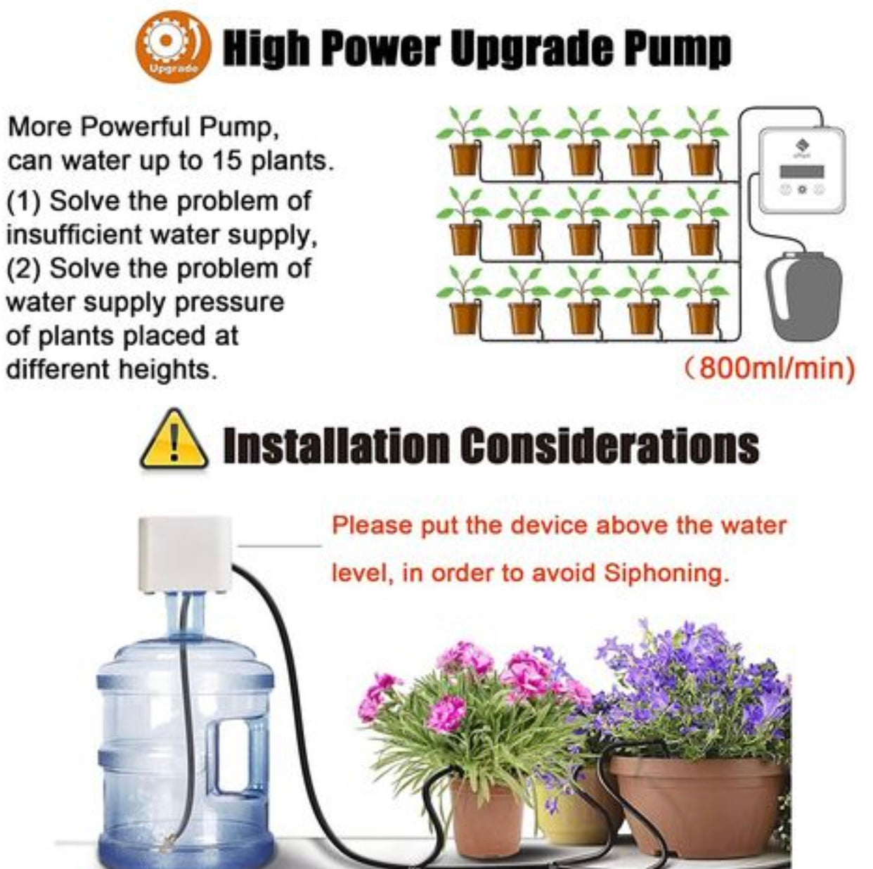 🌷【Pump Upgrade & Two Power Methods】High-power drip irrigation pump, power upgrade 5 times. Solve water pressure problems, strong water supply. Two type of power supply, 4 AA batteries (NOT Included) and USB cable charging;