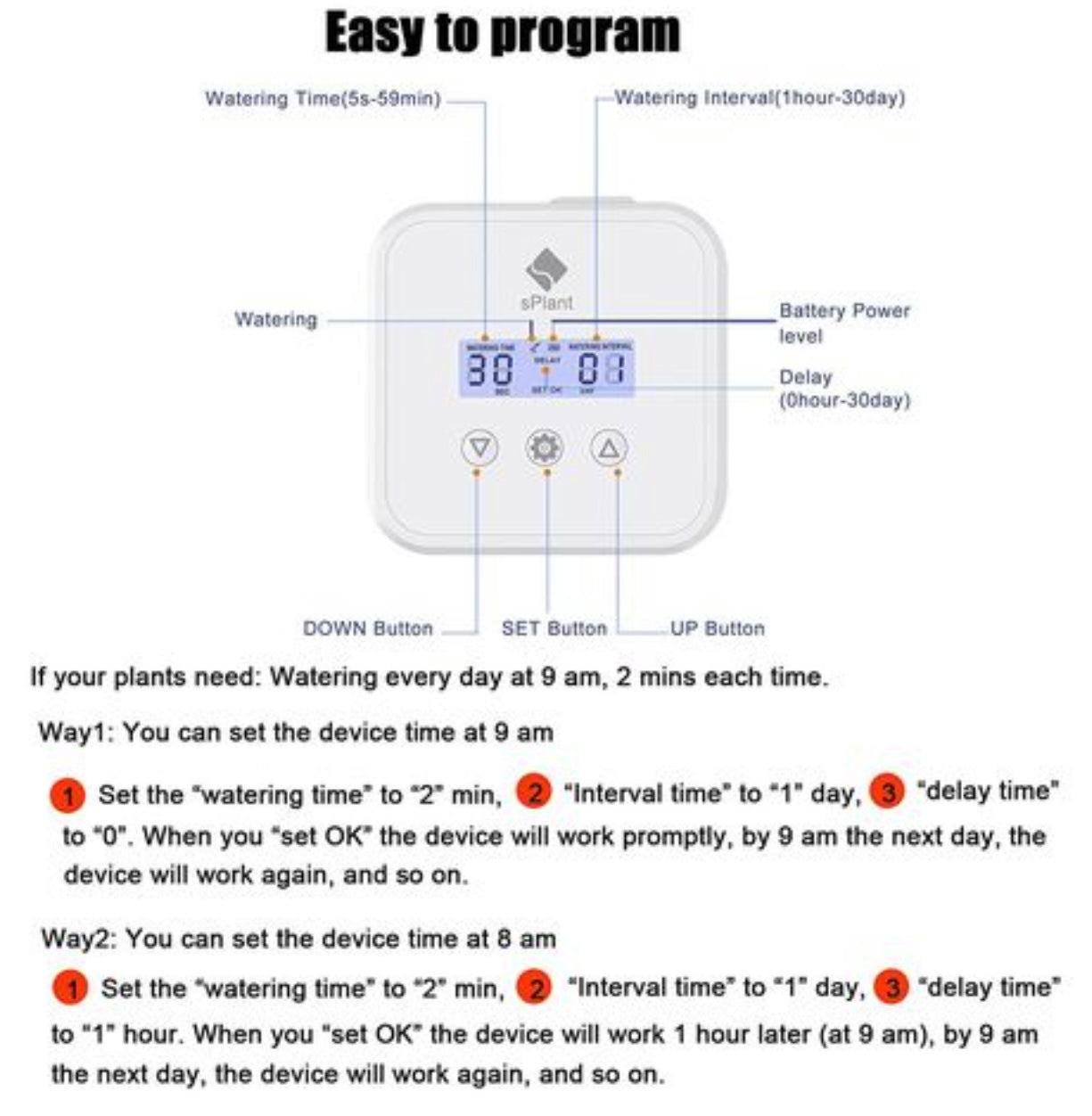 🌷【Italian Patent Design & Simplified Program】Patent minimalist industrial design from Italy team, always a classic look to your home. New version automatic watering system device is equipped with large LCD module, the display is clear and soft. Replace indicator light with flashing graphics, device status is easy to read. Redefine the setting logic, just by press the up and down button user can easily adjust the value and switch the unit, and then confirm the setting with the set button;