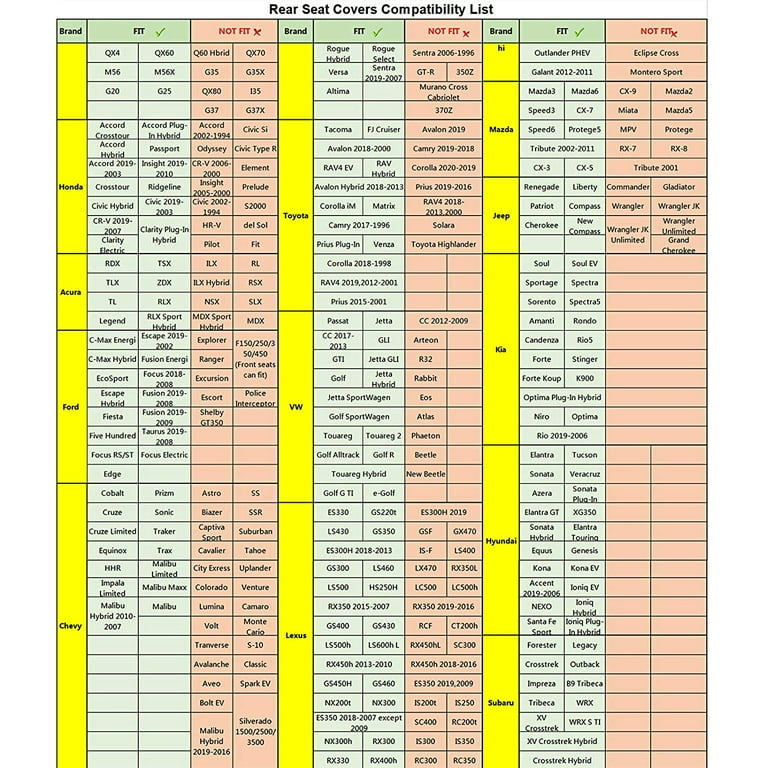 2. If your model is not listed here, it is recommended to check the seat cover's description and pictures to see if it fits your car.