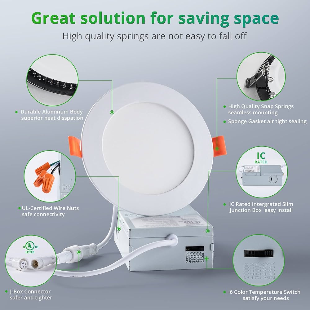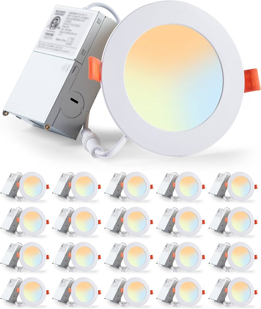 LEDIARY 20 Pack 4 Inch 6CCT Ultra-Thin LED Recessed Ceiling Light with Junction Box, 2500K-5000K Selectable Recessed Light Fixtures, 750LM, 9W Eqv 75W, Dimmable Can Lights - IC Rated, ETL
