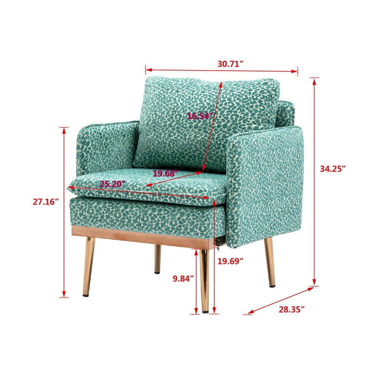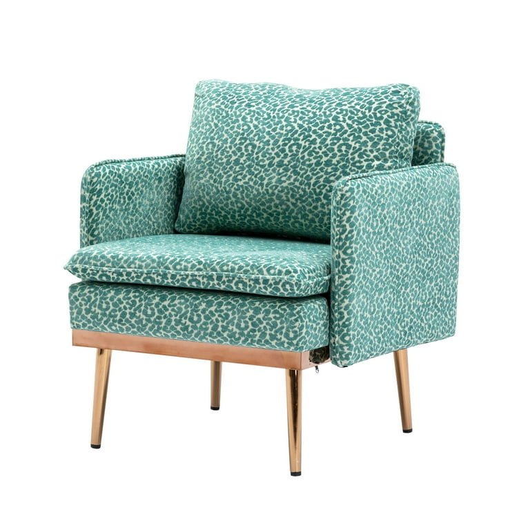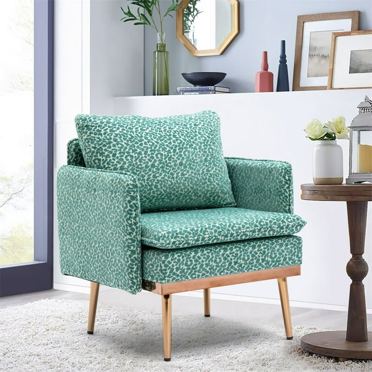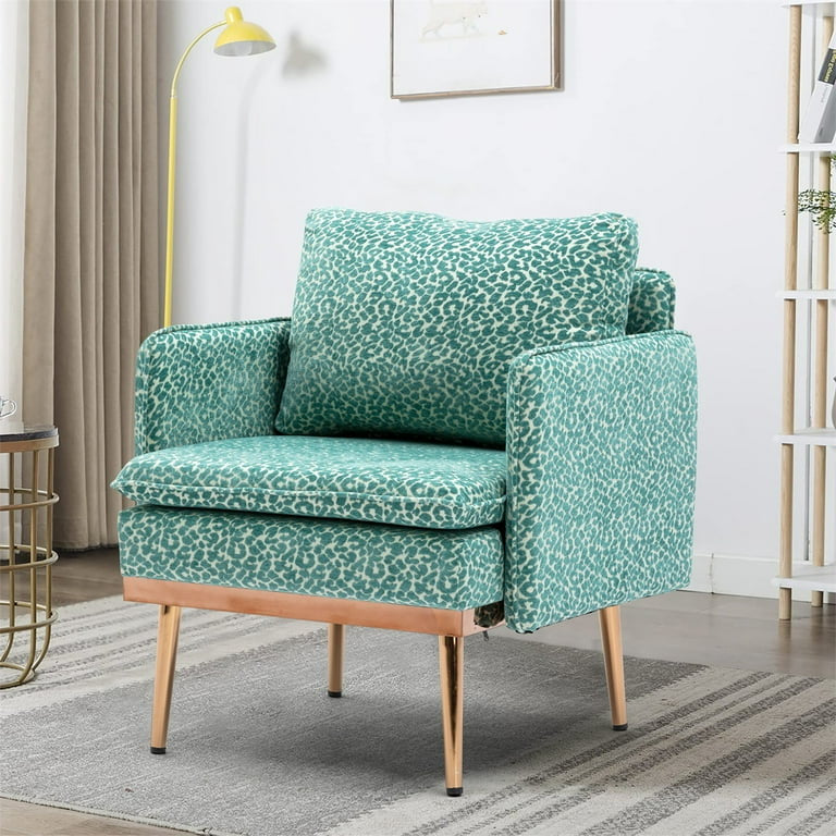 Living Room Accent Chair, Upholstered Chaise Lounge Chair with Armrest, Comfy Single Sofa Chair Reading Chair with Metal Feet for Home, Office, Apartment, Leopard Teal