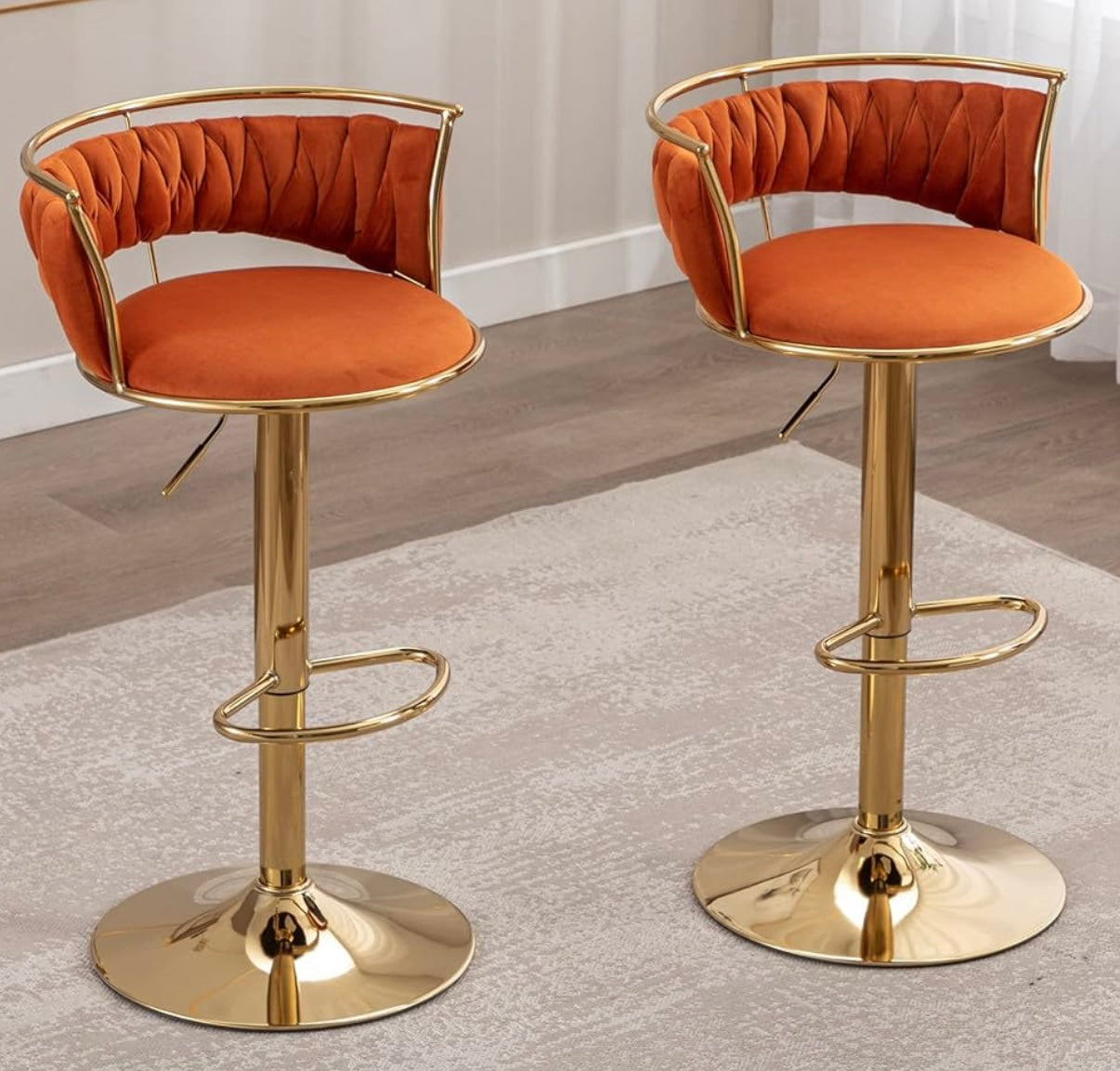 Modern Swivel Bar Stools Velvet Adjustable Height Barstools Low Back Kitchen Island Counter Bar Chair with Golden Base, Orange.Set of 1