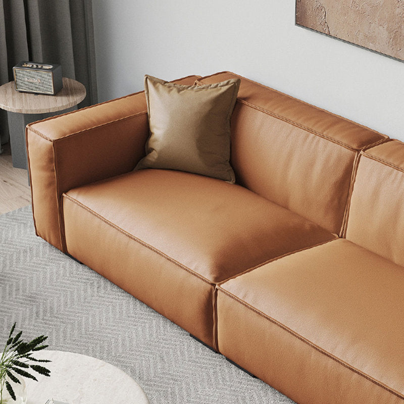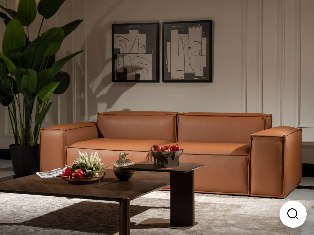 Modern Leather-Covered Sofa, crafted with sophistication and comfort in mind. Its rich brown hue exudes timeless elegance, complemented by square arms for a contemporary touch. This versatile piece seamlessly blends into any vintage living room or lounge setting, providing both style and relaxation. Whether for entertaining guests or lounging on lazy afternoons, this luxury sofa offers unparalleled comfort and aesthetic appeal, making it the perfect addition to any bedroom or living space.