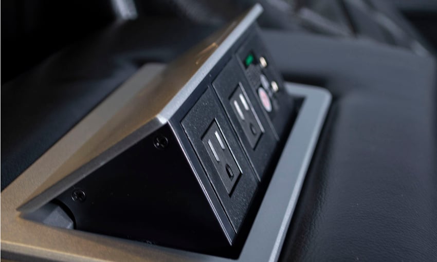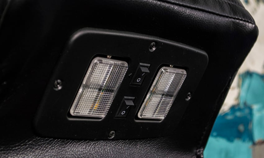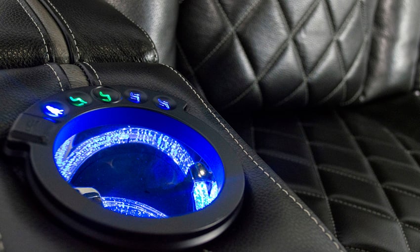 Save big and make TV time a true experience with this leather transformer theater sofa! Both power reclining ends feature a full-leg chaise and power headrest for complete comfort, tailored in quilted black top-grain leather for a luxury look and feel. The armrests come equipped with hidden storage and lighted cup holders, as well as built-in USB ports and contrast color welting for extra style. The center seat back also offers a convenient drop-down table with more cup holders, a pop-up AV charging strip with wireless charging, reading lights and a storage pocket. Whether you’re rooting for your favorite team, bingeing the show everyone’s talking about, or spending hours trying to master that new video game, this souped-up sofa with blue LED-lit underpanel will be the only worthy seat in the house