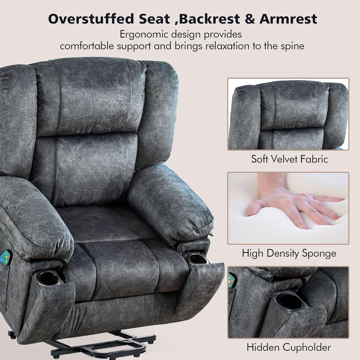 Power Lift Recliner Chair for Elderly,Lift Chair Fabric Recliner Chairs for Adults Comfort Velvet Recliner with Massage & Heat,and Hidden Cup Holder,Support Up to 330LBS