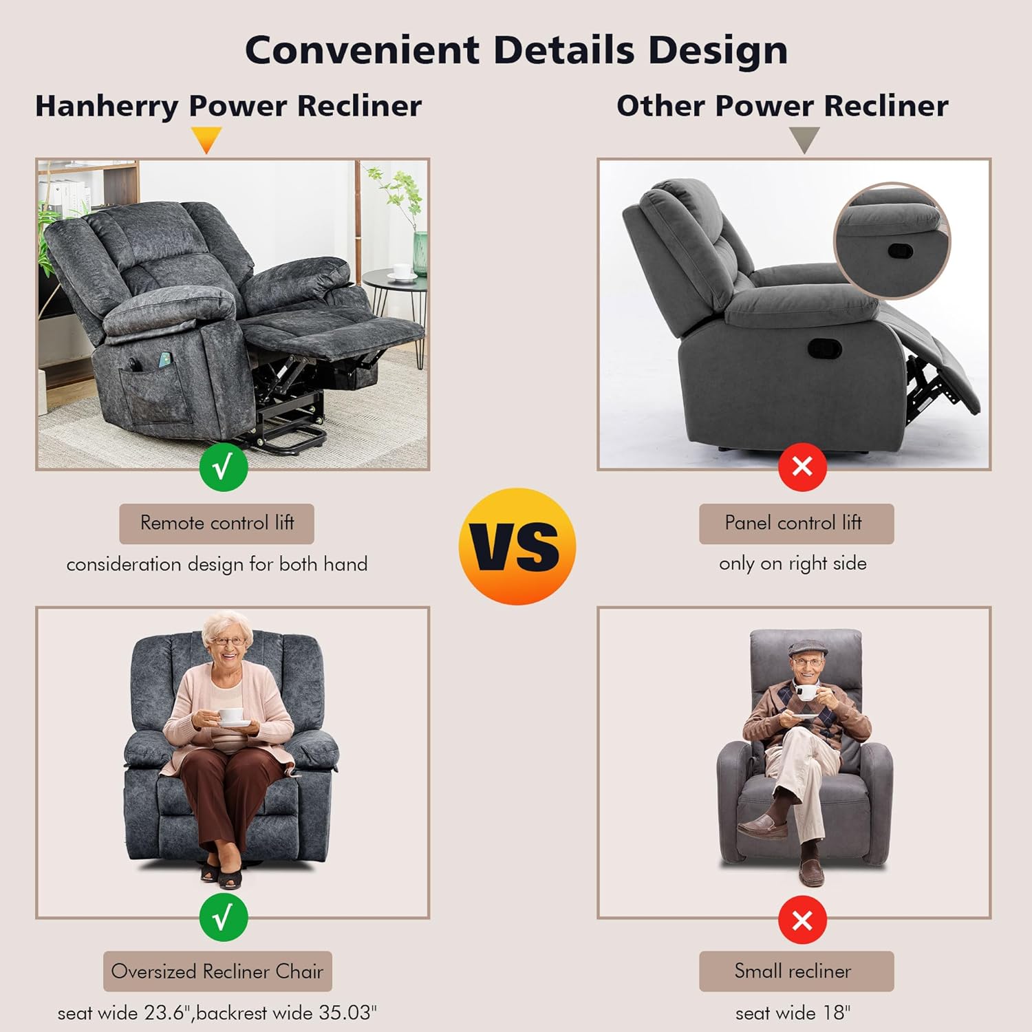 - 【Lift Assistant & Powerful Motor】Hanherry power lift recliner chair with silent motor offers electric lift function that gently raises the chair from its base, providing seniors,pregnant women,people after surgery with a convenient way to stand up while minimizing strain on their back and knees. The reclining angle can be easily adjusted up to 145°by using the remote control. The sturdy alloy steel frame, rigorously tested and certified by SGS, ensures a maximum weight capacity of 330lb for lasting durability and safety.