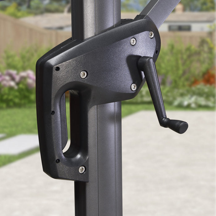 - The crank system of this cantilever umbrella makes it easy to raise and lower the canopy, the unique handle design also makes tilting the umbrella effortless, foot pedal allows for complete 360 degree rotation