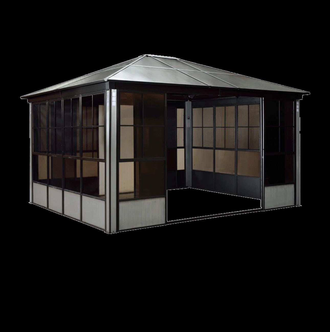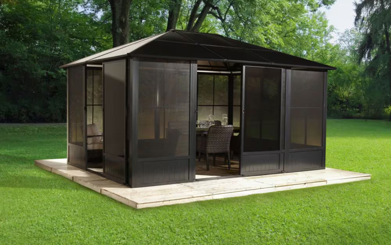 It's now possible to enjoy your backyard or hot tub all year round with this Solarium. The solarium's structure has an aluminum frame and includes a rigid roof, PVC windows and mosquito screens to keep those pesky bugs at bay. This solarium unit easily creates an intimate outdoor space while sheltering you and your guests from the harsh and unpredictable elements. Enjoy fresh air with plenty of room for an outdoor spa, lounge furniture, or an ample outdoor dining table.