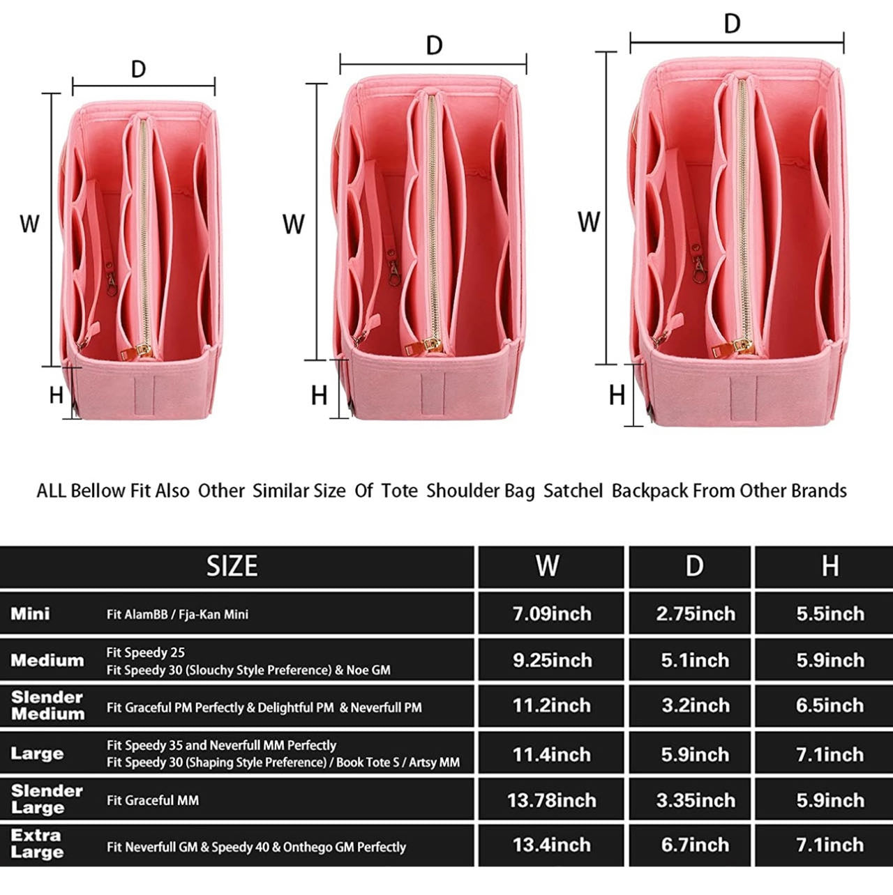 Large: 11.4 (W) x 7.1 (H) x 5.9 inches (D) fits perfectly on Speedy 35 and Neverfull MM and fits perfectly on Speedy 30 (Modeling Style Preference).