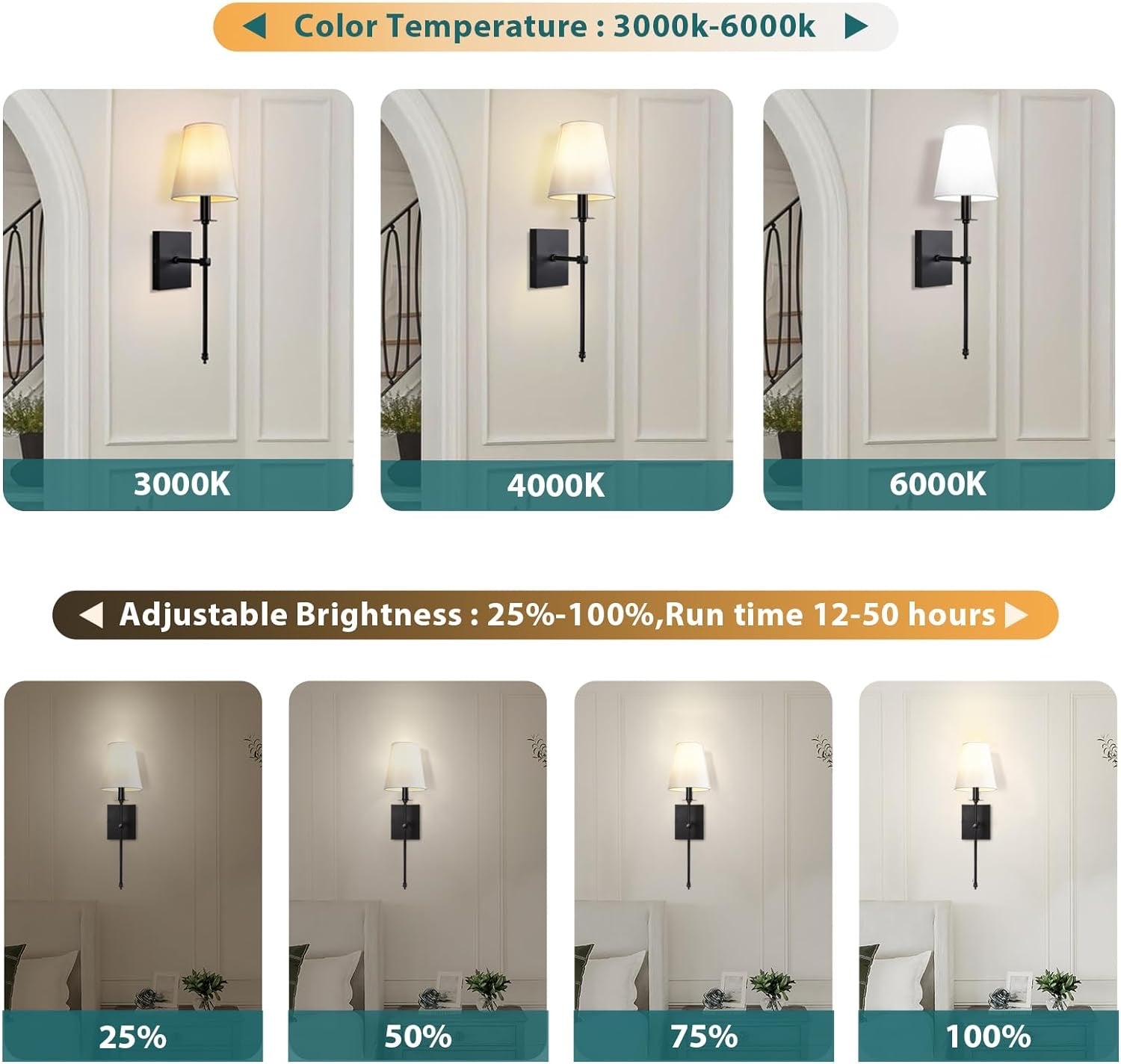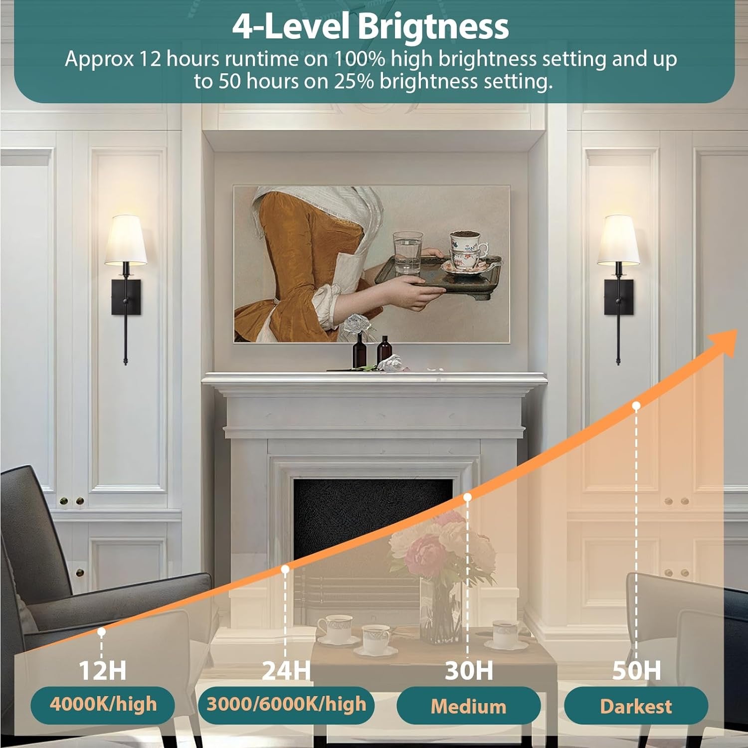 - 4 Brightness Dimmable:The battery operated wall light has 4 lighting modes, adjustable to 25%, 50%, 75% and 100%, which can last 12-50 hours, saving you from high electricity cost and hassle of frequent bulb replacing.