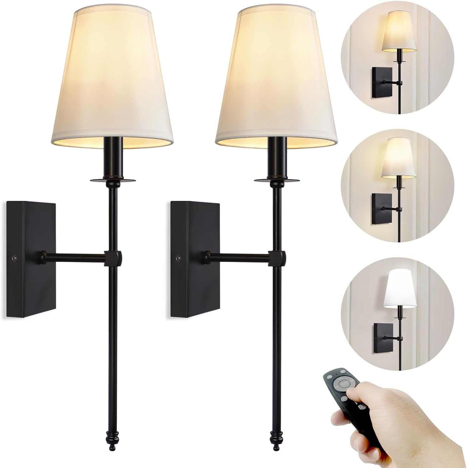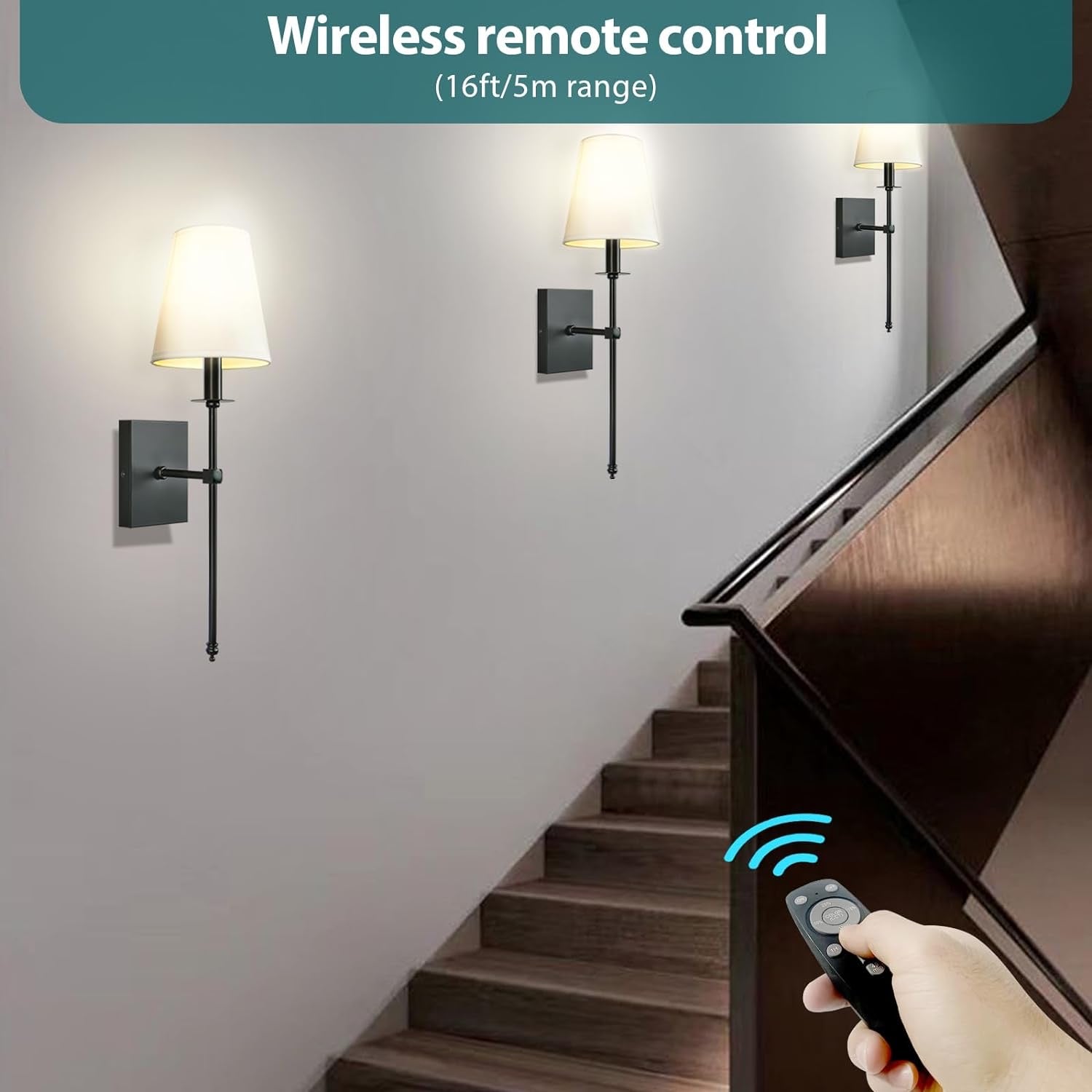 Set of 2 Rechargeable Battery Operated Wall Sconces with Remote Control, No Wiring 3000/4000/6000K Dimmable Wall Light with White Fabric Shade and Black Long Slim Arm