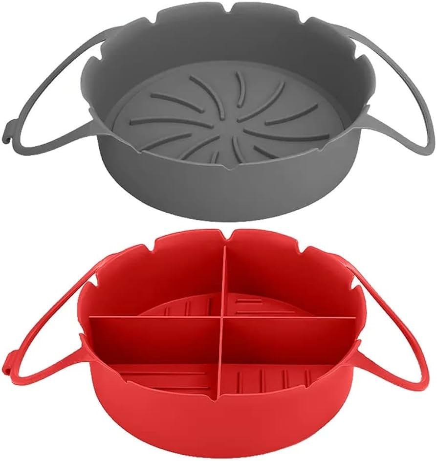Silicone Air Fryer Liners Pot and Silicone Basket Bowl with divider, Parchment Paper Replacement, Reusable Heat Resistant Baking Tray Oven Accessories, 8 inch Fits 5-8qt (2 Pack, Grey & Red)