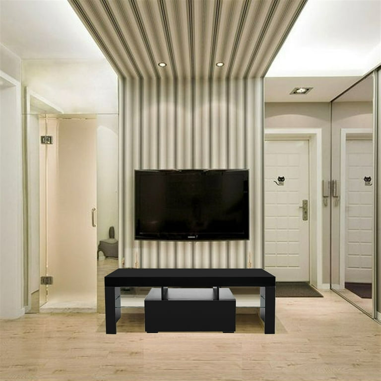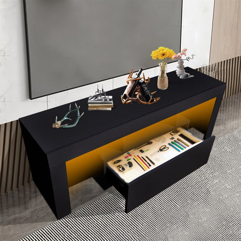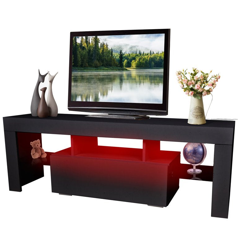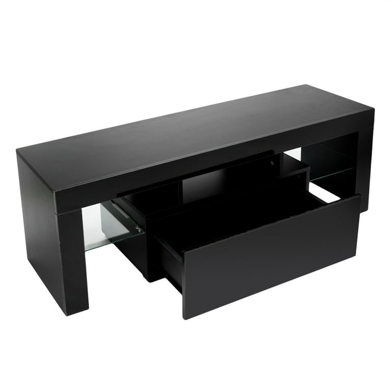 ENTERTAINMENT CENTER: This TV stand with LED comes with 16 RGB LED BACKLIGHT, 4 LIGHT MODE & BRIGHTNESS ADJUSTMENTS.Equipped with REMOTE CONTROL makes changes of light ever easy PERFECT SIZE: 51Lx 14Wx 18Hinch, this white TV console fit up to 55 inch TV. Spacious tabletop along with 1 large storage drawer satisfies all your display and storage needs in the bedroom or living room.FUSING DESIGN WITH FUNCTION: Featuring a modern and simple design, this TV Stand with Led fits with different room theme, and the LED lights could create different atmosphere for your room.DURABLE & STABLE: Made of P2 grade particleboard, this TV stand is scratch proof and waterproof, and easy to maintain. The modern and minimalist structure also provides great stability, with up to 110 pounds bearing capacity.EASY TO ASSEMBLE: Clear instruction and necessary accessories are included in the package. The simple structure of the TV stand makes it super easy to assemble. If you have any questions about our product, please do not hesitate to contact us. We are here to help you 7x24 hours. Mainly Feature: Quantity: 1pc. Material:Melamine Particle board or Chipboard ColourBROWN+WHITE Applicable scene:Bedroom, Lounge room,living room,etc. In view of the complicated installation, it is recommended that you install according to the installation instructions. Each panel and mounting parts have labels, please find the corresponding label to install Equipped with 16 colors adjustable LED lighting system, elegant enough for adding special charm to your house. Package Includes: 1pc×TV Cabinet all parts 1pc×Instruction manual